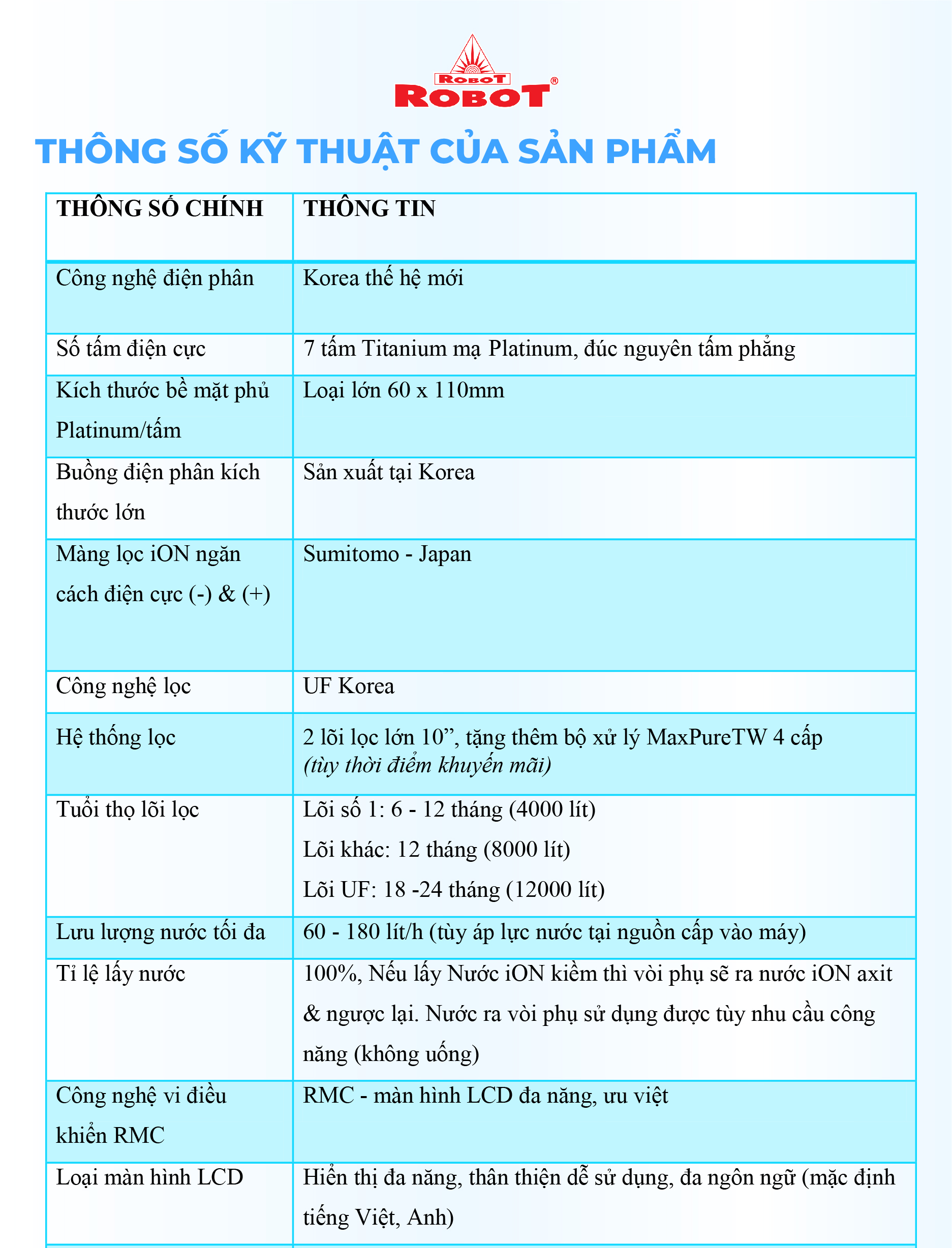 - ️ Máy lọc nước điện giải iON kiềm ROBOT ionSmart 710 là sản phẩm được sản xuất với công nghệ tiên tiến, cao cấp trang bị đến 7 tấm điện cực lớn nhất, có khả năng tạo ra đến 10 loại nước đa chức năng, với 5 mức nước iON kiềm (pH 8.5 – 10.5), nước lọc trung tính (pH 7.0) Nguội – Nóng & 3 mức nước iON axit (pH 4.5 - 5.5). Chất lượng nước đạt chỉ số tối ưu, nồng độ Hydro hoạt tính lên đến ~ 800 - 950 ppb, chống oxy hóa (ORP) lên đến ~ -400 -> -600 mV, đáp ứng mọi nhu cầu sử dụng trong cuộc sống.