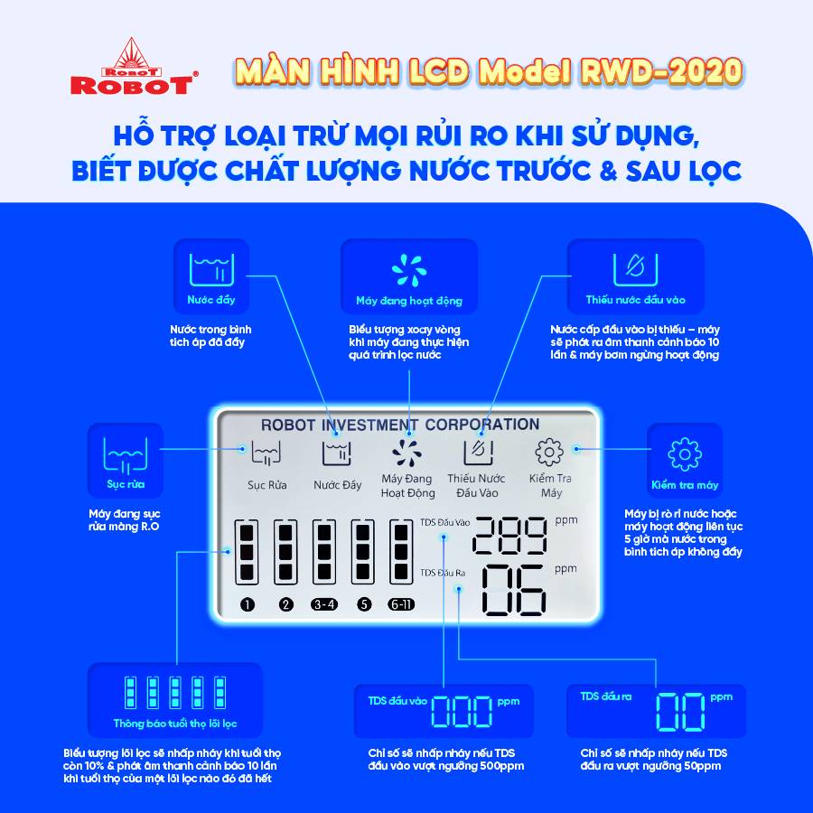 - Các sản phẩm máy lọc nước ROBOT đều sở hữu màn hình LCD sắc nét, hiển thị chi tiết các thông số TDS – chất lượng nước trước & sau lọc, tuổi thọ lõi lọc 24/24… để mọi người đều dễ dàng theo dõi hoạt động máy, chất lượng nước uống thông qua màn hình LCD, loại trừ mọi rủi ro, mang đến sự an toàn tuyệt đối khi sử dụng.