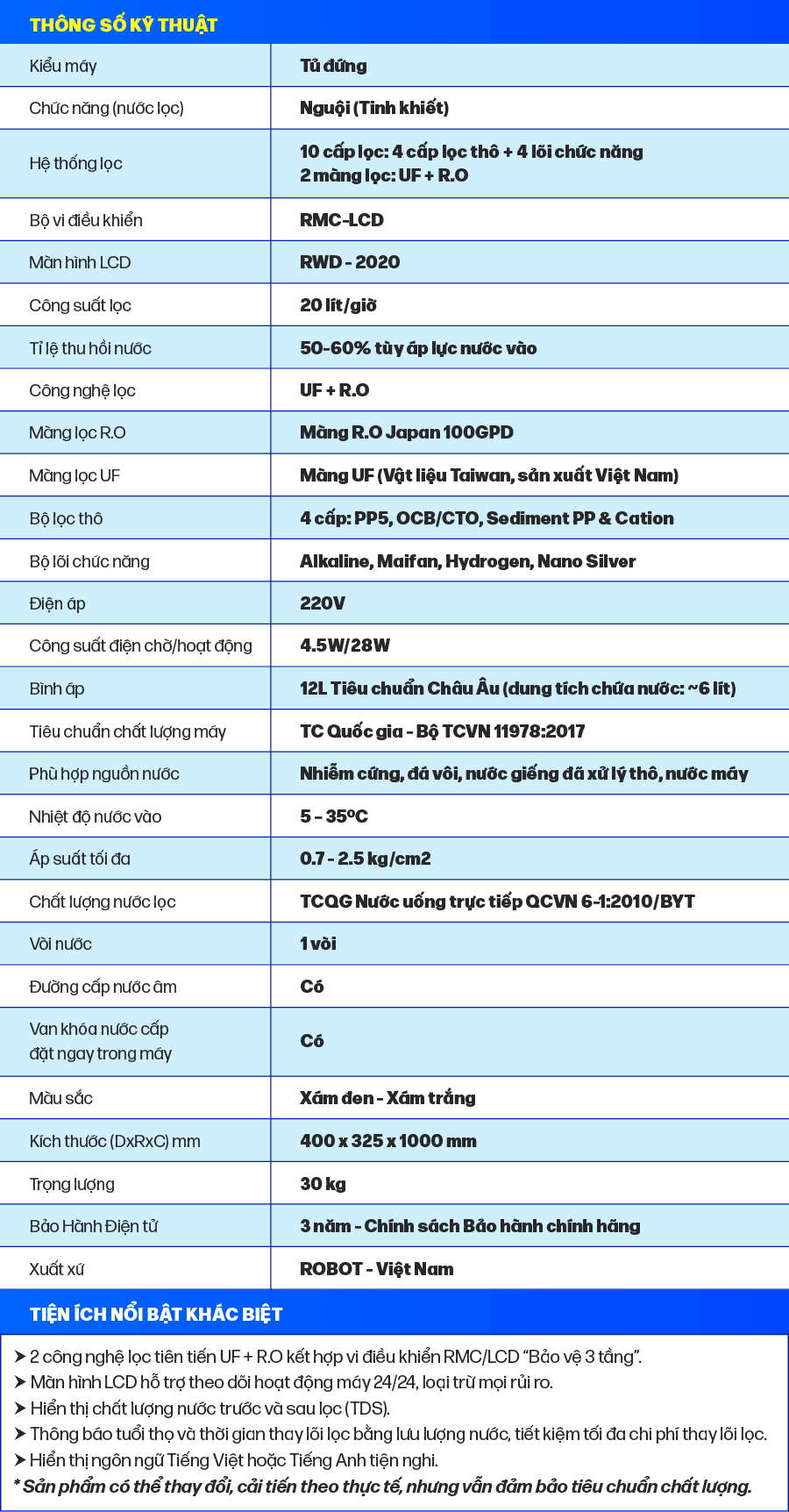 • Công nghệ RMC – LCD độc quyền, biết được chất lượng nước trước & sau lọc   Bộ vi mạch RMC-LCD thông minh thiết kế riêng của ROBOT, mọi chi tiết vận hành máy được hiển thị trên màn hình LCD, cảnh báo mọi rủi ro cho người sử dụng   Tuổi thọ lõi lọc được tính theo lưu lượng nước sử dụng, không tính theo thời gian ghim điện như các máy thông thường, tiết kiệm tối đa chi phí thay lõi lọc