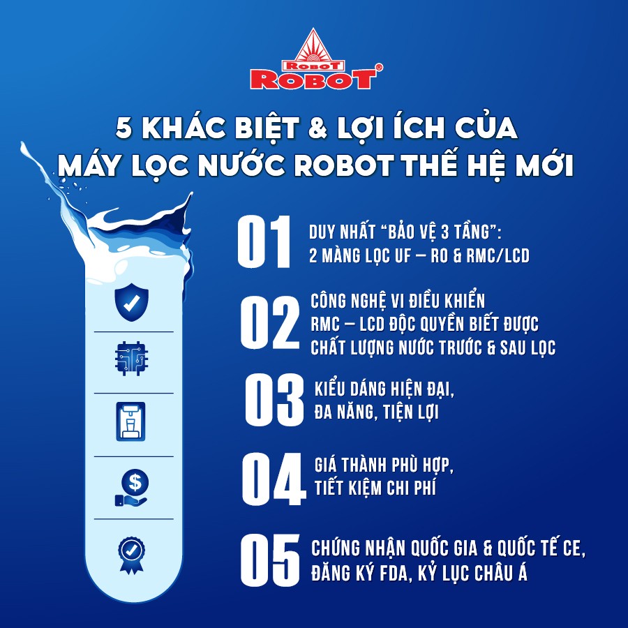 • Công nghệ RMC – LCD độc quyền, biết được chất lượng nước trước & sau lọc Bộ vi mạch RMC-LCD thông minh thiết kế phát minh của ROBOT, mọi chi tiết vận hành máy được hiển thị trên màn hình LCD, cảnh báo mọi rủi ro cho người sử dụng Tuổi thọ lõi lọc được tính theo lưu lượng nước sử dụng, không tính theo thời gian ghim điện như các máy thông thường, tiết kiệm tối đa chi phí thay lõi lọc