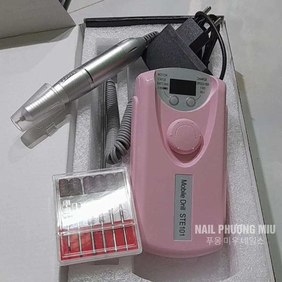 Máy Mài Móng Tích Điện STE-101 Màu Đen, Hồng Tặng Kèm 6 Đầu Mài Làm Nail Siêu Êm, Màn Hình LED, Nút Xoay Mobile Drill STE101 Pin Khỏe Đến 10h, Tốc Độ Cao 30.000 Vòng/phút Máy mài móng là dụng cụ không thể thiếu giúp thợ nail tiết kiệm thời gian mài dũa, phá sơn gel, loại bỏ vệt ố vàng trên bề mặt móng,... Máy mài STE-101 sử dụng pin dung lượng lớn có thể tích điện sử dụng trong vòng 10h. Thân máy được thiết kế đầy đủ các chức năng: Màn hình LED hiển thị thông số rõ nét. Nút xoay điều khiển tốc độ mài nhanh chậm (mức độ từ 1-30). Nút nhấn đảo chiều mài thuận lợi cho cả người thuận tay trái. Tay cầm mài bằng nhôm nhẹ, cầm chắc tay không bị rung khi mài, mang lại cảm giác dễ chịu khi mài trên móng. Phần đai kẹp ở mặt sau máy kết hợp cùng với giá đỡ có thể mắc vào túi, tạp dề,... giúp giữ tay cầm không bị rơi vỡ, thất lạc. Đặc biệt, máy mài STE-101 được hỗ trợ hệ thống bảo vệ chống quá tải sẽ tự động ngắt nguồn điện khi máy hoạt động quá công suất. Khách hàng được tặng kèm 6 chiếc đầu mài gồm nhiều loại khác nhau. Thông tin sản phẩm:
