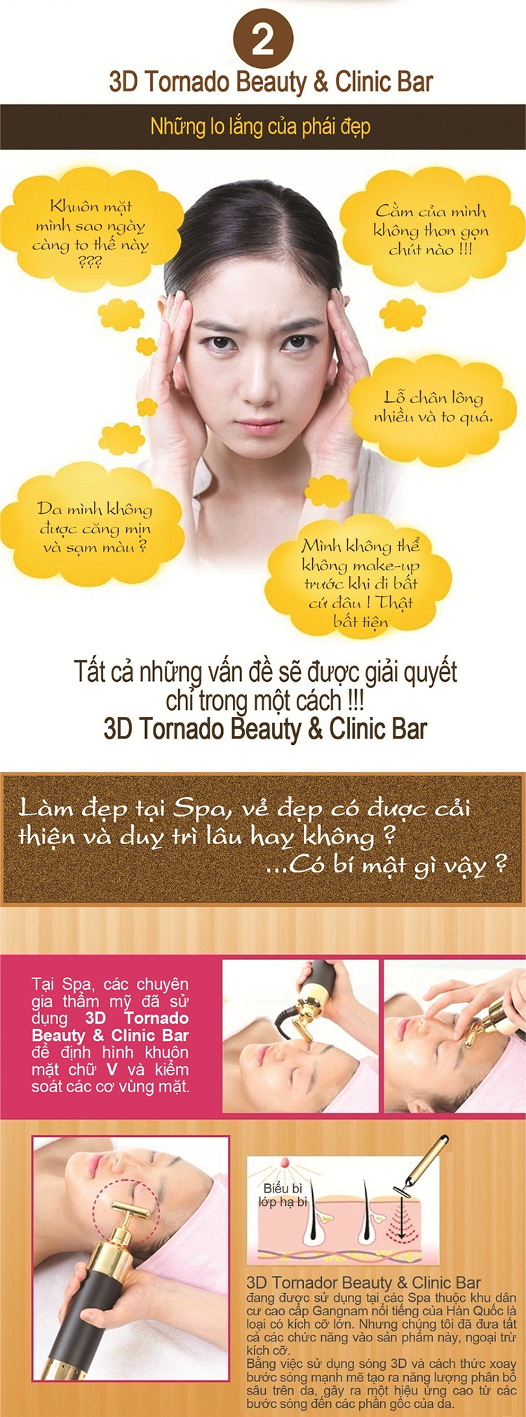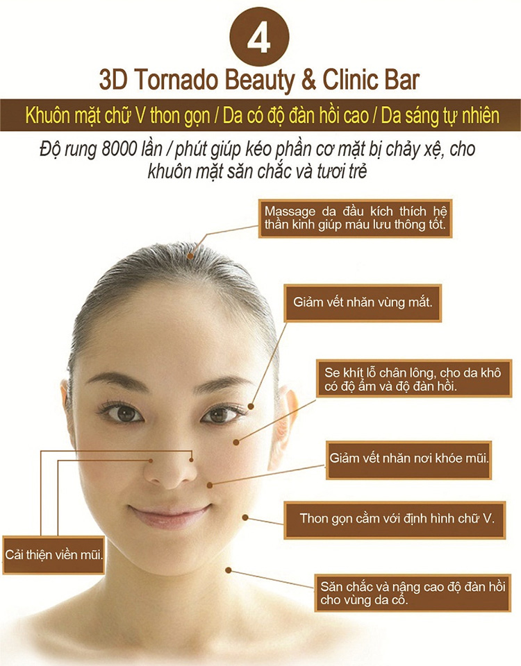 - Máy Massage 3D Tornado Beauty & Clinic Bar đa chức năng mang lại hiệu quả trong dưỡng da và phòng chống lão hóa. Bên cạnh đó máy còn có thể mát xa da đầu,