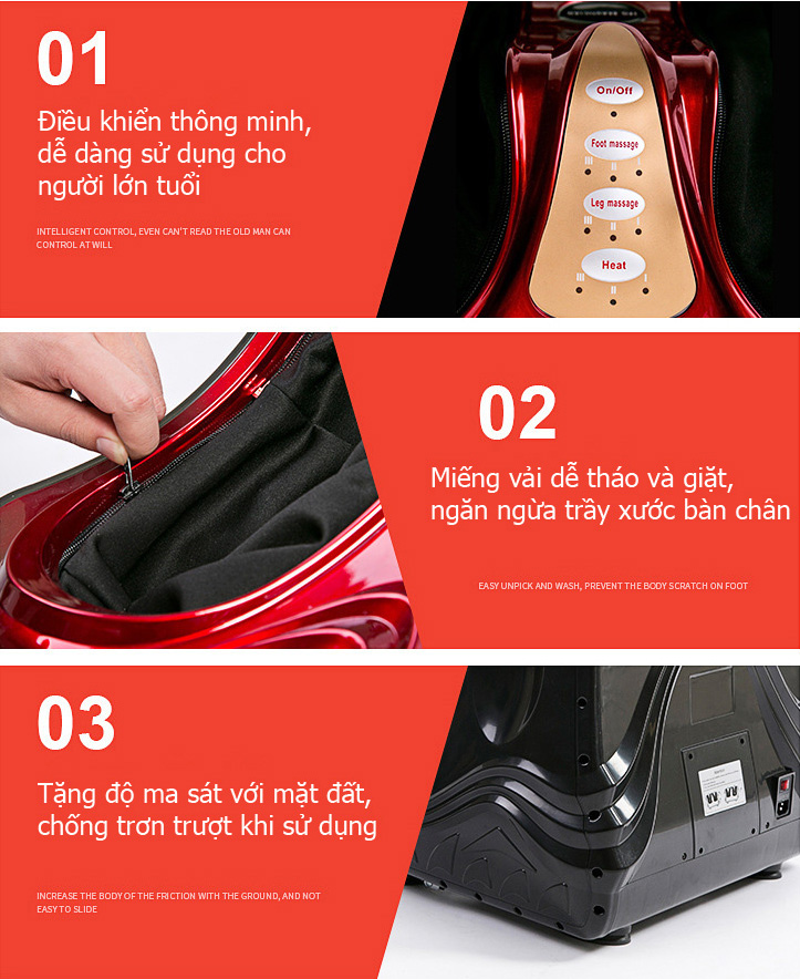 - Xông hơi bằng công nghệ siêu âm - Kiểm soát mức nhiệt hơi tự động với 3 chế độ cài đặt - Massage con lăn kích thích các điểm huyệt dưới gan bàn chân