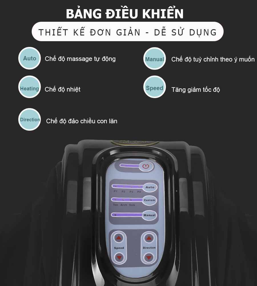 Hệ thống con lăn, túi khí mát xa từ ngón chân đến lòng bàn chân, gót chân, mắt cá chân và ngay cả bắp chân.