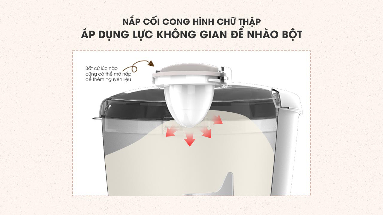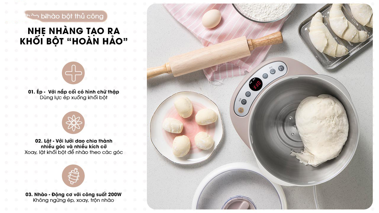 - trang bị 3 đầu trộn bằng thép không gỉ siêu bền, siêu an toàn cho phép người dùng có thể nhào bột làm bánh, đánh kem, đánh trứng, quết giò/chả, một cách mịn, nhuyễn nhất.