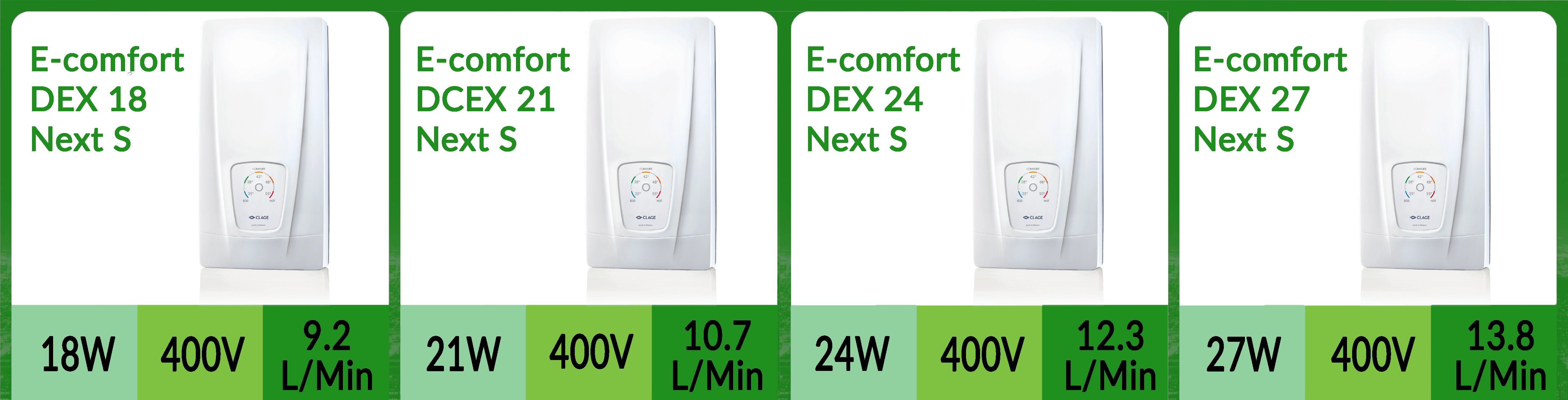Máy nước nóng tức thì E-Comfort DEX Next S. DEX Next là sản phẩm bán chạy nhất hiện được trang bị khả năng kiểm soát tốc độ dòng chảy tự động với SERVOTRONIC thế hệ