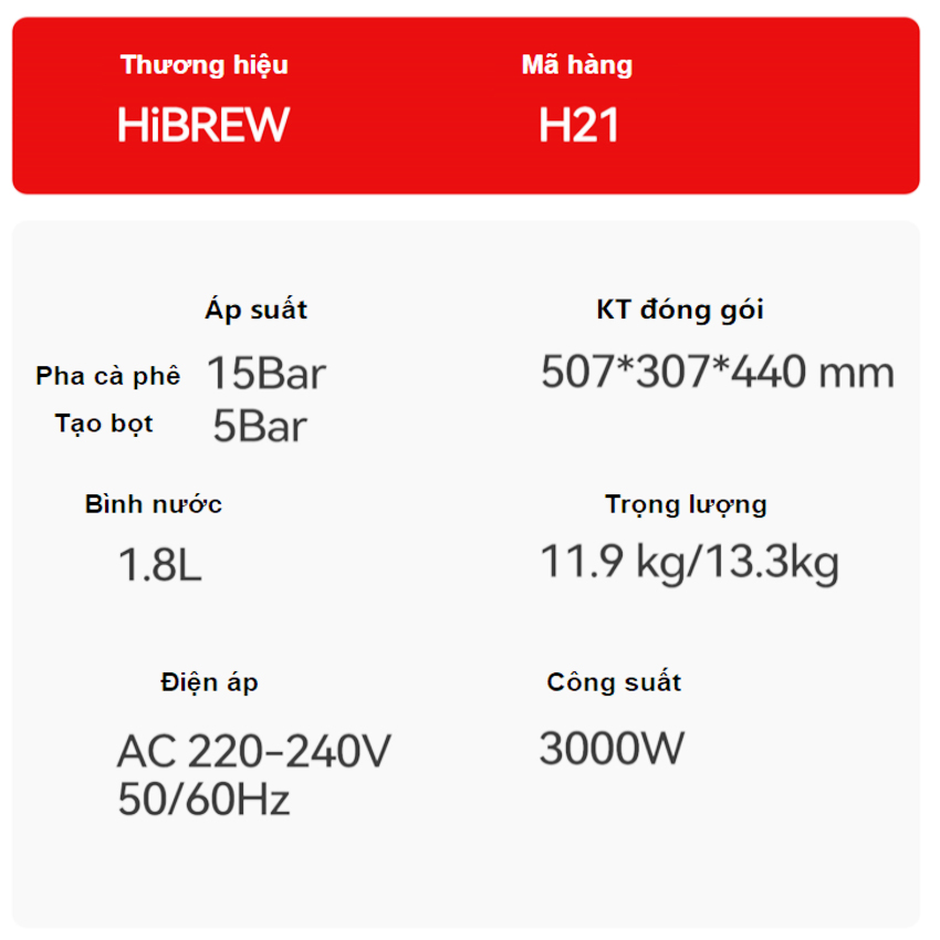 - Máy pha cà phê Espresso chuyên nghiệp HiBREW H21 có công suất hoạt động là 3000W cho phép pha tối đa 130 ly/ngày. Nhờ đó đáp ứng được nhu cầu sử dụng tại các văn phòng, quán cà phê, khách sạn... Hệ thống gia nhiệt kép PID + NTC cao cấp