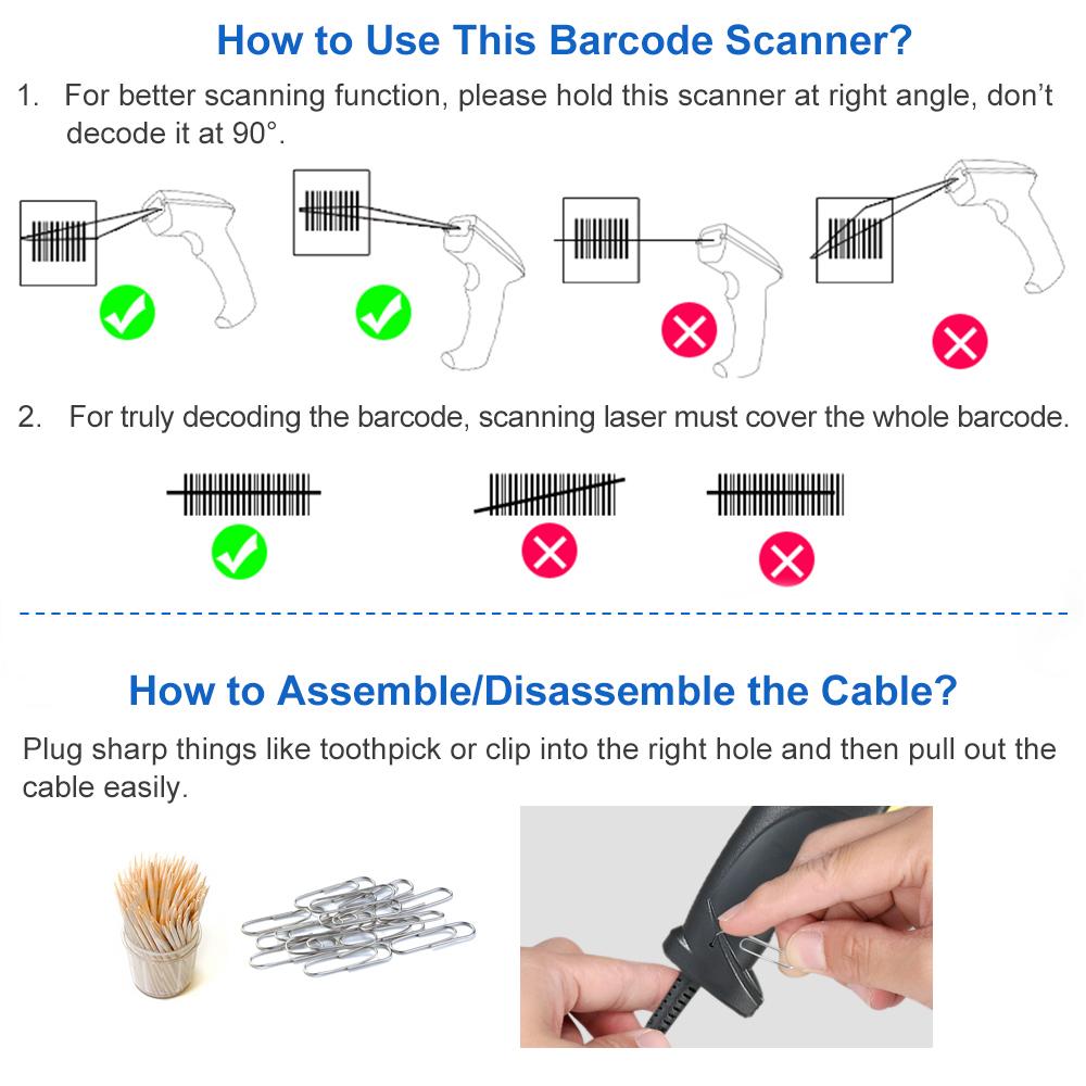 The barcode scanner is simple for installation and great for use in a wide range of situations and workplaces. It can read all the standard 1D bar codes, including UPC/EAN, UPC/EAN(include complement code), Code128, UCC/EAN128,
