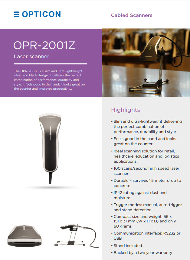 Tổng Quan Sản Phẩm Máy quét mã vạch OPTICON OPR-2001Z là máy quét mã vạch cầm tay laser tốc độ cao, được thiết kế mỏng, gọn, nhẹ với kiểu dáng đẹp, mang lại trải nghiệm quét mượt mà,