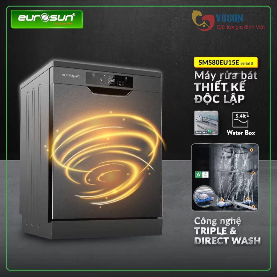 MÁY RỬA BÁT EUROSUN SMS80EU15E NHẬP KHẨU NGUYÊN CHIẾC TỪ CHLB ĐỨC VỚI THIẾT KẾ SANG TRỌNG CÙNG DUNG TÍCH CHỨA LÊN TỚI TRÊN 14 BỘ BÁT ĐĨA. AN TOÀN, BỀN BỈ VÀ TIẾT KIỆM