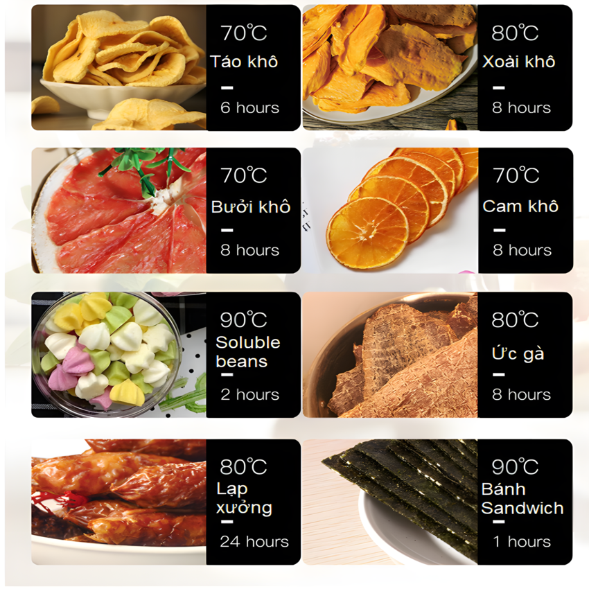 - Loại thực phẩm sấy: Trái cây, dược liệu, rau củ quả, thịt, tôm, cá, hải sản,....