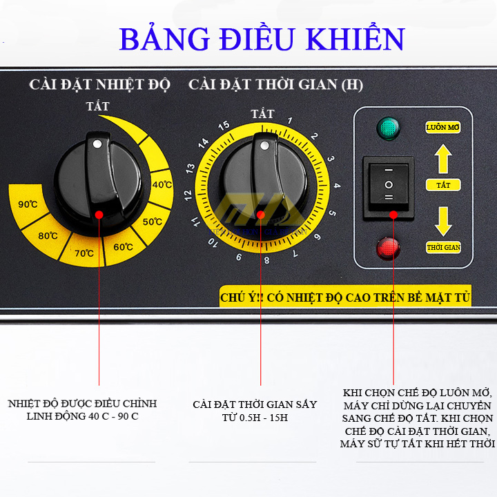 - Cảm biến nhiệt tự động duy trì nhiệt độ cài đặt bên trong buồng sấy.