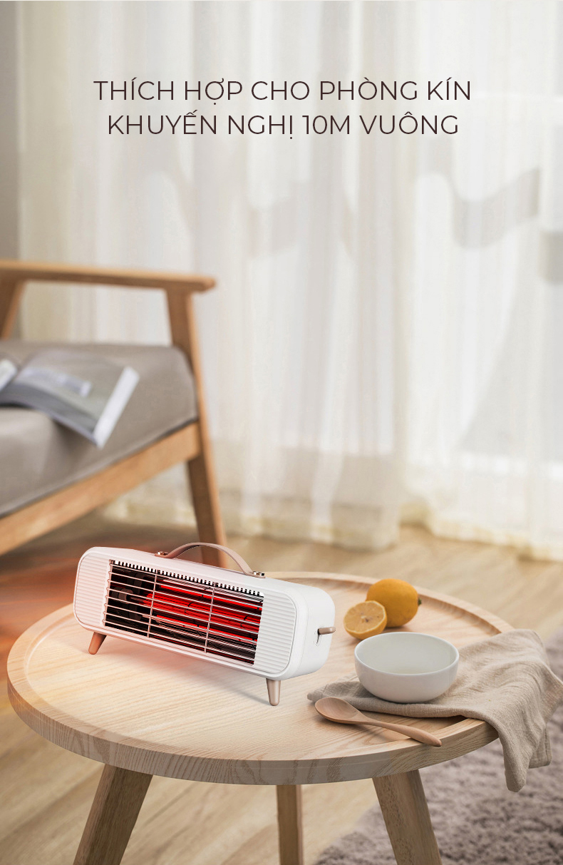 Thiết kế nhỏ gọn, tiện dụng Sưởi ấm nhanh, không gây tiếng ồn 3 mức phát nhiệt Có tính năng quay đảo hướng phát nhiệt, phạm vi phát nhiệt rộng Lưới tản nhiệt thiết kế