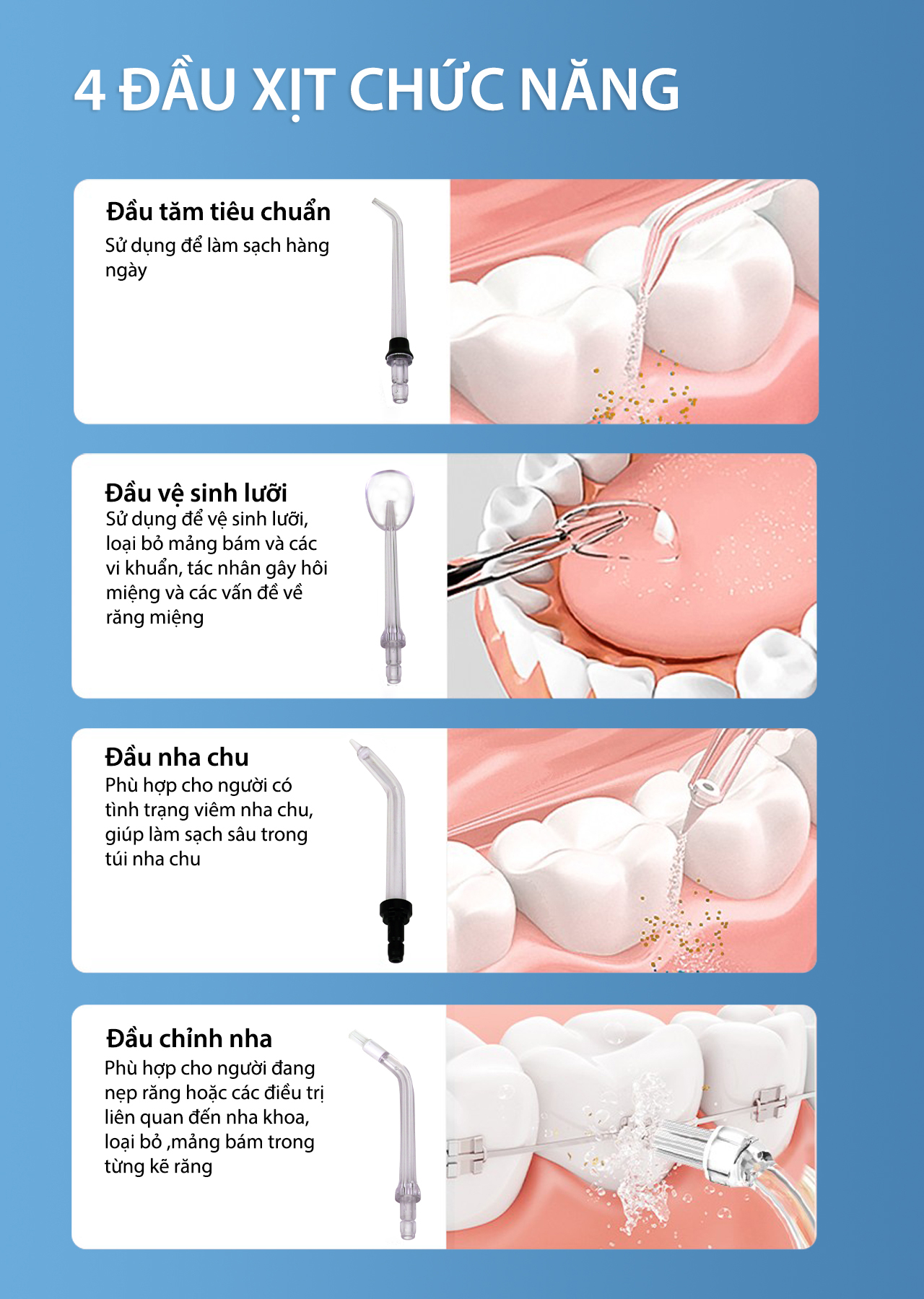 - Cổng sạc USB tiện lợi: Tăm nước được trang bị cổng sạc USB, cho phép bạn dễ dàng sạc pin ở bất kỳ đâu, bất kỳ lúc nào, chỉ cần có kết nối USB. 5 đầu tăm đi kèm: Sản phẩm đi kèm 5 đầu tăm khác nhau, bao gồm 2 đầu tiêu chuẩn, 1 đầu vệ sinh nướu, 1 đầu chỉnh nha và 1 đầu vệ sinh lưỡi. Đầu tăm có thể xoay 360 độ, giúp tiếp cận và làm sạch mọi ngóc ngách trong khoang miệng.