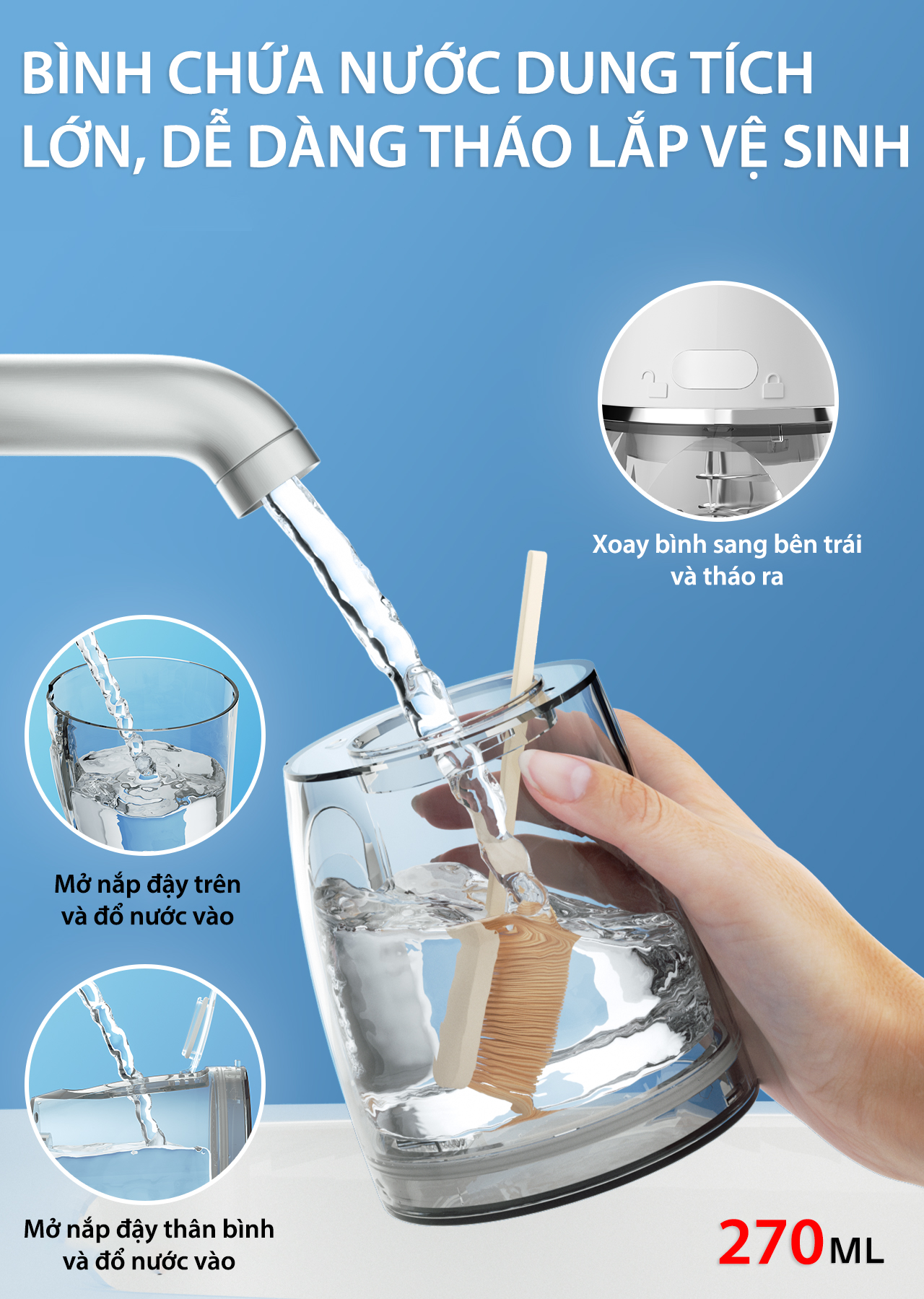 - Bình nước dung tích lớn: Bình chứa nước 270ml, dễ dàng tháo lắp và vệ sinh, đủ để sử dụng trong một lần làm sạch răng miệng mà không cần phải nạp nước nhiều lần. Tính năng an toàn: