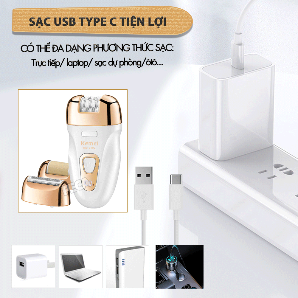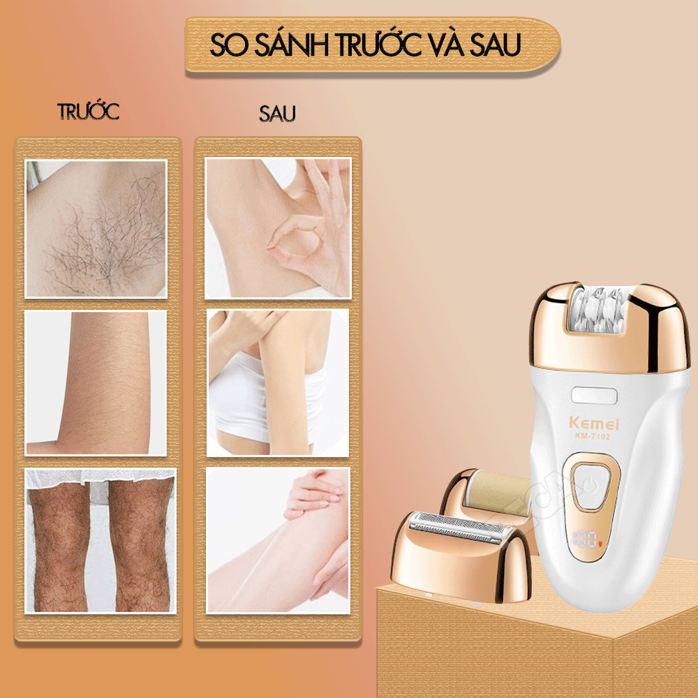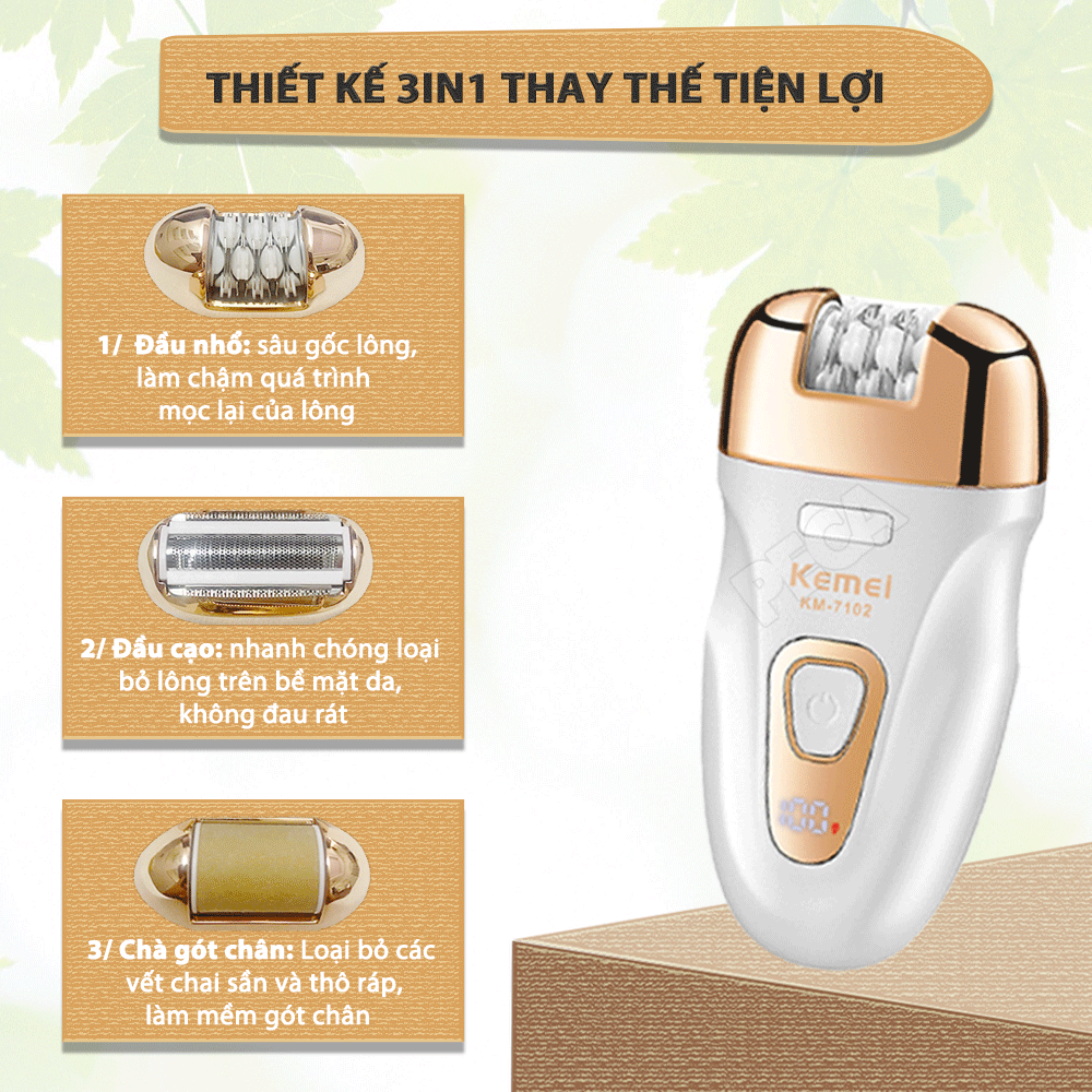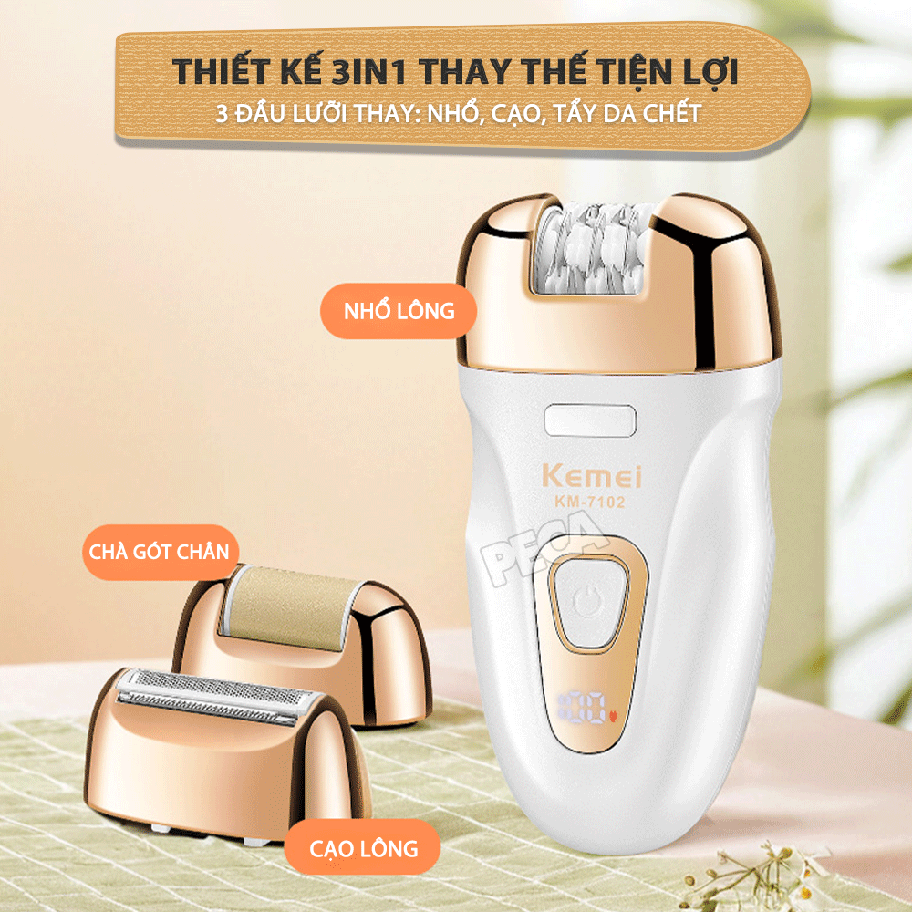 ✨Máy tẩy lông đa năng 3in1 Kemei KM-7102 gồm 3 đầu thay thế chuyên dụng nhổ lông, cạo lông, chà gót chân sử dụng toàn thân - Chính hãng