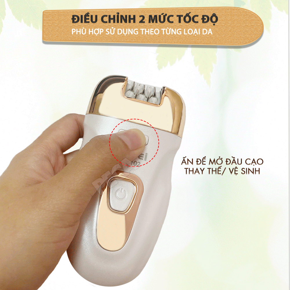 - Máy cạo lông Kemei KM-7102 điều chỉnh 2 mức tốc độ theo nhu cầu sử dụng của người dùng. Bạn có thể lựa chọn giữa các mức tốc độ khác nhau, tùy thuộc vào vùng da và độ dày của lông.