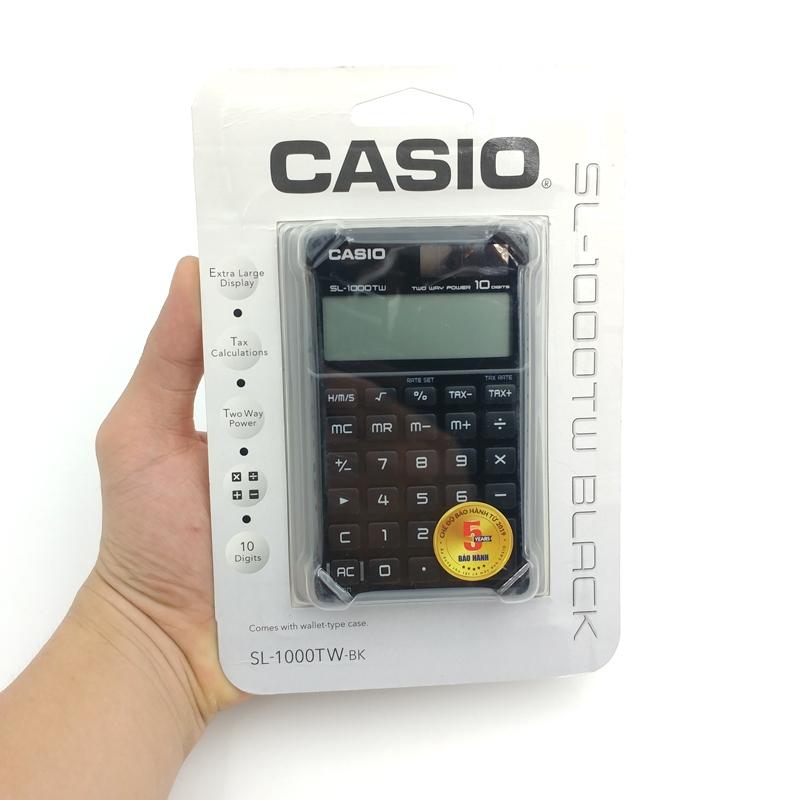 Máy Tính Casio SL1000SC-BK Kích thước máy tính: 11.5 x 7 x 0.8 cm Tính thuế: Tự động tính toán giá cộng thuế, giá trừ thuế, khoản chiết khấu, giá bán, số tiền thuế, số