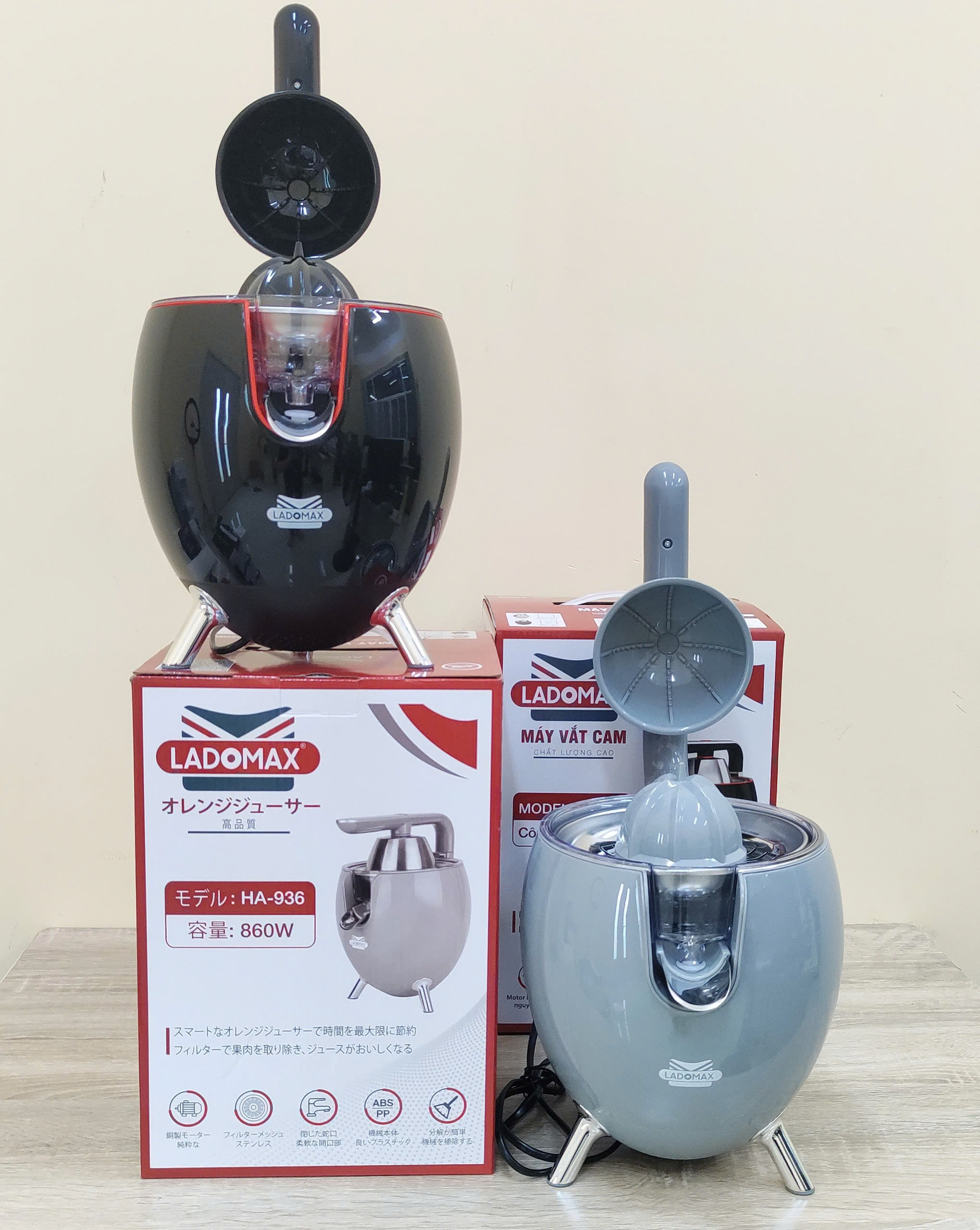 Thông tin sản phẩm Thương hiệu: Ladomax Máy: Máy vắt cam, vắt chanh Công suât: 860W Model :HA936 Núm: 2 đầu nấm lớn nhỏ Khay lọc: Inox Điện áp: 220-240V, 50/60HZ Bảo hành 12 tháng
