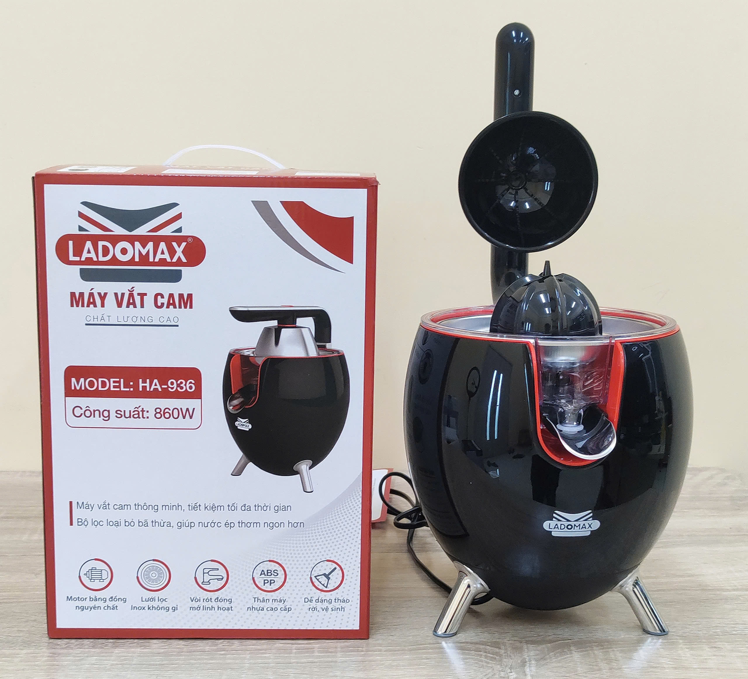 Thông tin sản phẩm Thương hiệu Ladomax chính hãng Máy: Máy vắt cam công nghiệp Công suât: 860W Model : 936 màu đen Điện áp: 220-240V, 50/60HZ Bảo hành