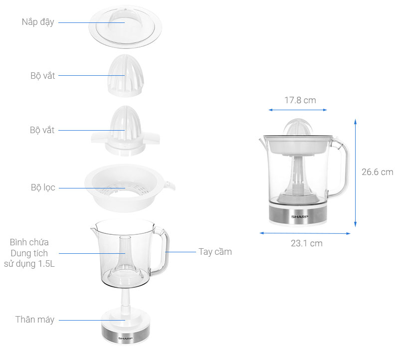 Máy vắt cam Sharp 1.5 lít EJ-J415-WH - Thiết kế nhỏ gọn, tiện lợi - Công suất: 40 W - Dung tích: 1.5 L - Chất liệu: Nhựa Trang bị 2 đầu vắt lớn, nhỏ