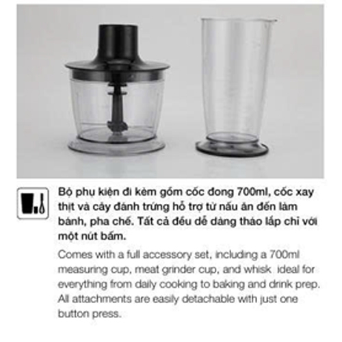 • Phụ kiện: cốc đong 700mL, cốc xay thịt và cây đánh trứng