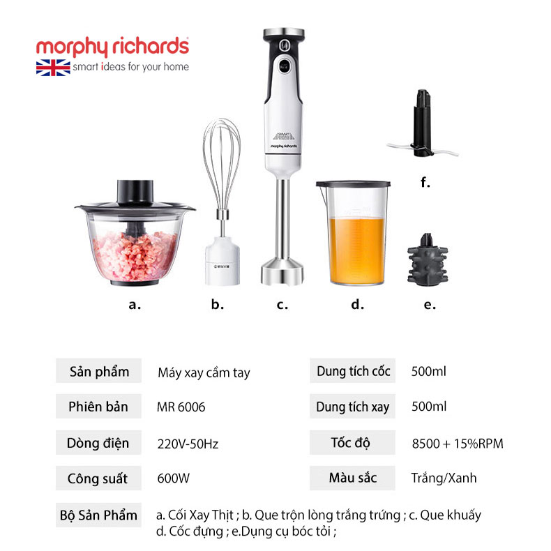 Máy xay cầm tay Morphy Richards MR6006, 4 trong 1, sinh tố, đánh trứng, bóc tỏi và xay thịt