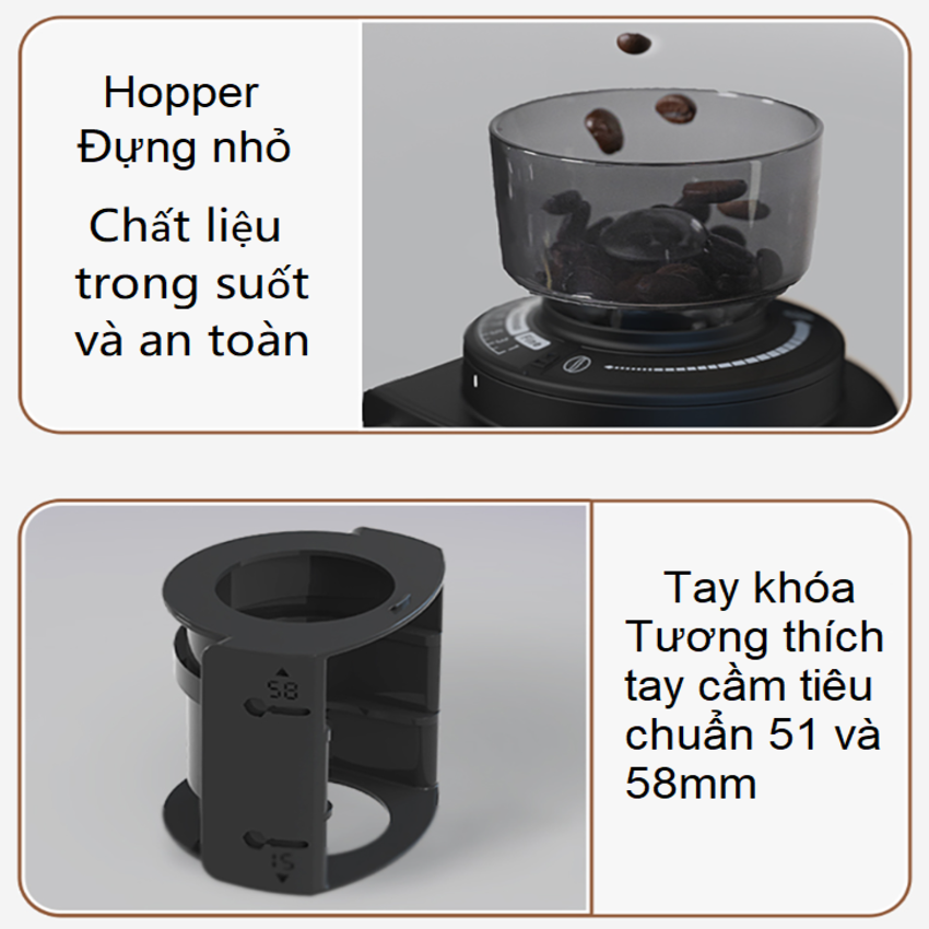 - Khay chứa cà phê trong suốt giúp bạn dễ dàng quan sát cà phê đang xay đồng thời dễ dàng tháo lắp tạo sự thuận tiện cho bạn khi chùi rửa.