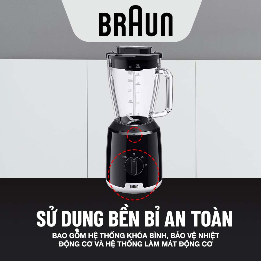 - An Toàn & Dễ Vệ Sinh Hệ thống an toàn 3-Way Protection Braun JB1015BK được trang bị 3 lớp bảo vệ thông minh: ️ Tự ngắt khi quá nhiệt – bảo vệ động cơ, kéo dài tuổi thọ máy. Chốt khóa an toàn – máy chỉ hoạt động khi lắp đúng khớp. ️ Chân đế chống trượt – giữ máy vững chắc khi xay. Thêm vào đó, các bộ phận có thể tháo rời dễ dàng, hỗ trợ vệ sinh nhanh chóng và tiết kiệm thời gian sau mỗi lần sử dụng.