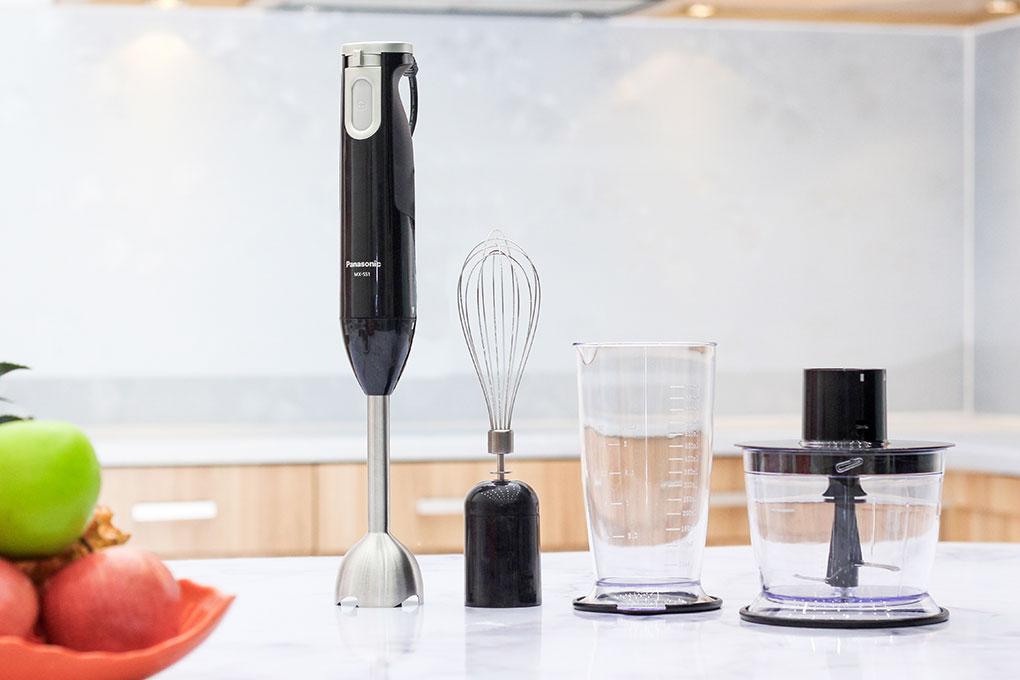 Máy xay sinh tố cầm tay Panasonic PASO-MX-SS1BRA được trang bị 1 cây xay, 1 cây đánh trứng và 1 cốc đo bằng nhựa cao cấp dễ vệ sinh.