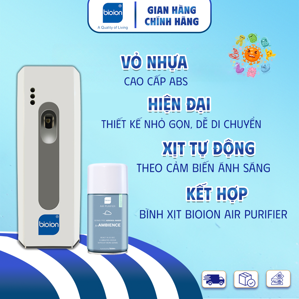 Mua tại TiktokChức năng xịt tự động theo cảm biến ánh sáng DAY: Xịt liên tục khi có ánh sáng (kể cả ánh sáng đèn). NITE: Xịt liên tục trong đêm (trong không gian tối). 24H: Xịt liên tục 24h (cả ngày và đêm). Chế độ thời gian xịt lặp lại sau: 7.5 phút, 15 phút, 25 phút. Sử dụng với 2 Pin AA (kẽm) tiết kiệm, an toàn. Vỏ máy bằng nhựa cao cấp Abs với kiểu dáng hiện đại .Thiết kế gọn nhẹ, dễ dàng di chuyển. Sử dụng với bình xịt Bioion Air Purifier 250ml/3000 lần xịt. Vui lòng OFF máy trước khi thay đổi chế độ cài đặt. Đặt máy ở độ cao 2m, diện tích 20-25m2 (tránh gió, nơi thoáng khí). CAM KẾT TỪ NHÀ PHÂN PHỐI
