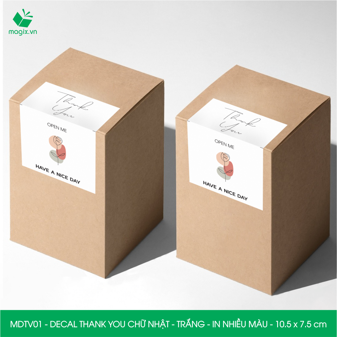 Decal - sticker Thank You là loại nhãn dán có nội dung "Cám ơn" được thiết kế theo hình chữ nhật. Decal Thank You thường được sử dụng để trang trí đóng gói thời trang,