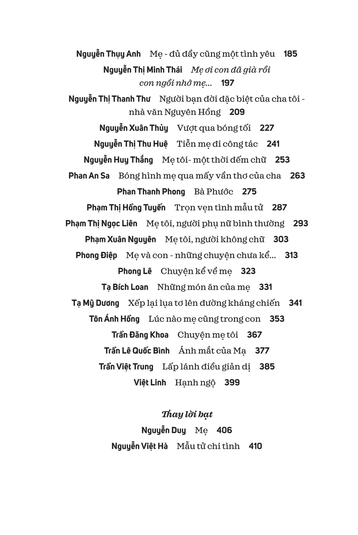 Mua tại TiktokCuốn sách tập hợp các bài viết chân thực, xúc động và hết sức độc đáo về tình cảm, kỷ niệm giữa mẹ con của những người nổi tiếng ở nhiều lĩnh vực khác nhau trong xã hội.