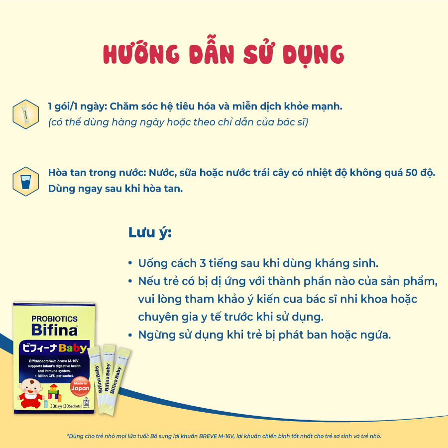 Hỗ trợ tiêu hoá khoẻ, tăng đề kháng cho bé - Men vi sinh Bifina Baby Nhật Bản- Hộp 30 gói Đối tượng sử dụng: Dành cho trẻ em từ 0 tháng tuổi cần bổ