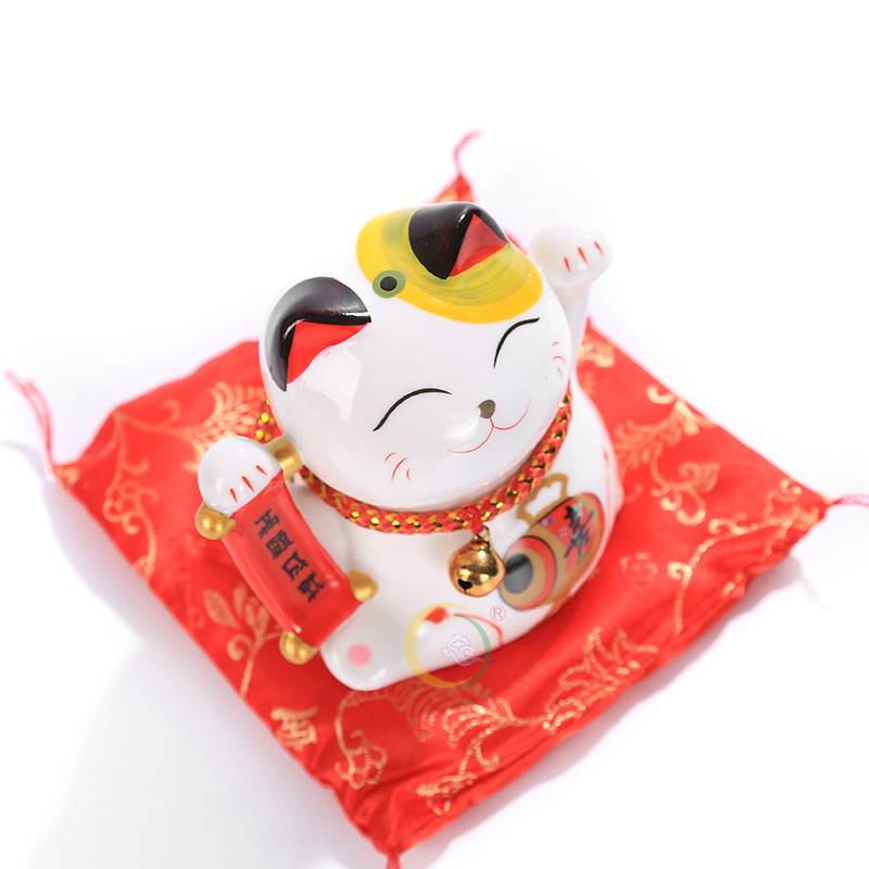 - Mèo thần tài được làm từ chất liệu gốm sứ cao cấp, để tránh bị đổ vỡ nên mèo được đặt trên tấm đệm bông in hoa đẹp mắt. Chú mèo có hình dáng