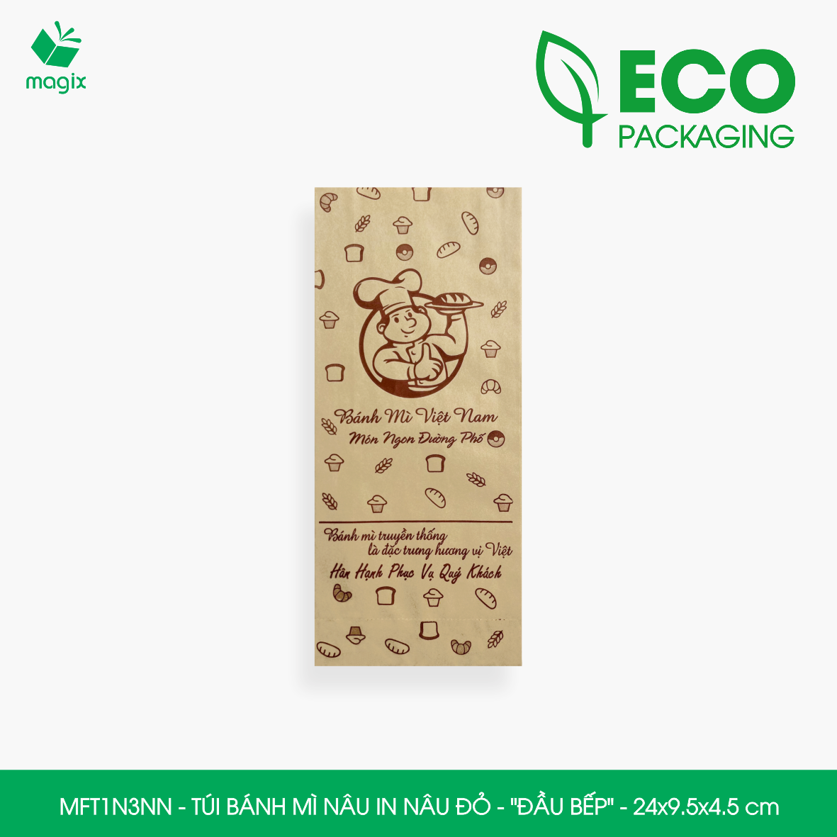 ĐẶC ĐIỂM SẢN PHẨM Chất liệu: Túi bánh mì in thường được làm từ giấy kraft nhật định lượng 50gsm thấm dầu có giấy chứng nhận FDA đảm bảo vệ sinh an toàn thực phầm Thiết kế: Miệng túi thiết kế chia thành 2 lớp dễ dàng thao tác bỏ bánh mì vào túi, đơn giản và tiện dụng    CÔNG DỤNG Tiện lợi: Bảo vệ bánh mì khỏi bụi bẩn, môi trường ô nhiễm, tác động từ bên ngoài và tránh làm dơ tay khi sử dụng Quảng cáo thương hiệu: Túi bánh mì in được sử dụng như một phương tiện quảng cáo nhỏ gọn và hiệu quả, với thiết kế in ấn logo, thông tin về sản phẩm và các thông điệp quảng cáo khác Bảo vệ môi trường: Túi bánh mì được làm từ chất liệu giấy kraft nguyên sinh, giúp giảm thiểu lượng rác thải nhựa và bảo vệ môi trường Tiết kiệm chi phí: Túi giấy bánh mì có giá thành thấp hơn so với các loại bao bì khác như hộp giấy, hộp nhựa đựng bánh mì   TIÊU CHUẨN KỸ THUẬT Chất liệu: Giấy Kraft chuyên dùng cho thực phẩm đạt tiêu chuẩn FDA  Định lượng: 50gsm Mã hàng - Kiểu in - Kích thước  • MFT1N5NN - Túi bánh mì nâu in nâu - "Giỏ bánh mì" - 24x9.5x4.5 cm  • MFT1T5N - Túi bánh mì trắng in nâu - "Giỏ bánh mì" - 24x9.5x4.5 cm  • MFT1N4X - Túi bánh mì nâu in xanh lá - "Best street food" - 24x9.5x4.5 cm  • MFT1T4X - Túi bánh mì trắng in xanh lá - "Best street food" - 24x9.5x4.5 cm  • MFT1N4NN - Túi bánh mì nâu in nâu đỏ - "Best street food" - 24x9.5x4.5 cm  • MFT1T4N - Túi bánh mì trắng in nâu - "Best street food" - 24x9.5x4.5 cm  • MFT1T3C - Túi bánh mì trắng in cam - "Đầu bếp" - 24x9.5x4.5 cm  • MFT1N3NN - Túi bánh mì nâu in nâu đỏ - "Đầu bếp" - 24x9.5x4.5 cm  • MFT1T3NN - Túi bánh mì trắng in nâu đỏ - "Đầu bếp" - 24x9.5x4.5 cm  • MFT1N2NN - Túi bánh mì nâu in nâu đỏ - "Cối xay gió" - 24x9.5x4.5 cm  • MFT1T2N - Túi bánh mì trắng in nâu - "Cối xay gió" - 24x9.5x4.5 cm  • MFT1N1NN - Túi bánh mì nâu in nâu đỏ - "Xe bánh mì" - 24x9.5x4.5 cm  • MFT1T1N - Túi bánh mì trắng in nâu - "Xe bánh mì" - 24x9.5x4.5 cm   LƯU Ý Bảo quản sản phẩm nơi khô ráo, sạch sẽ tránh tiếp xúc trực tiếp với ánh nắng mặt trời và nhiệt độ cao.