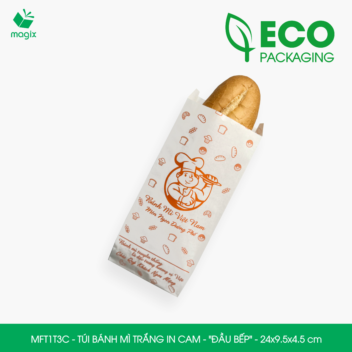 ĐẶC ĐIỂM SẢN PHẨM Chất liệu: Túi bánh mì in thường được làm từ giấy kraft nhật định lượng 50gsm thấm dầu có giấy chứng nhận FDA đảm bảo vệ sinh an toàn thực phầm Thiết kế: Miệng túi thiết kế chia thành 2 lớp dễ dàng thao tác bỏ bánh mì vào túi, đơn giản và tiện dụng    CÔNG DỤNG Tiện lợi: Bảo vệ bánh mì khỏi bụi bẩn, môi trường ô nhiễm, tác động từ bên ngoài và tránh làm dơ tay khi sử dụng Quảng cáo thương hiệu: Túi bánh mì in được sử dụng như một phương tiện quảng cáo nhỏ gọn và hiệu quả, với thiết kế in ấn logo, thông tin về sản phẩm và các thông điệp quảng cáo khác Bảo vệ môi trường: Túi bánh mì được làm từ chất liệu giấy kraft nguyên sinh, giúp giảm thiểu lượng rác thải nhựa và bảo vệ môi trường Tiết kiệm chi phí: Túi giấy bánh mì có giá thành thấp hơn so với các loại bao bì khác như hộp giấy, hộp nhựa đựng bánh mì   TIÊU CHUẨN KỸ THUẬT Chất liệu: Giấy Kraft chuyên dùng cho thực phẩm đạt tiêu chuẩn FDA  Định lượng: 50gsm Mã hàng - Kiểu in - Kích thước  • MFT1N5NN - Túi bánh mì nâu in nâu - "Giỏ bánh mì" - 24x9.5x4.5 cm  • MFT1T5N - Túi bánh mì trắng in nâu - "Giỏ bánh mì" - 24x9.5x4.5 cm  • MFT1N4X - Túi bánh mì nâu in xanh lá - "Best street food" - 24x9.5x4.5 cm  • MFT1T4X - Túi bánh mì trắng in xanh lá - "Best street food" - 24x9.5x4.5 cm  • MFT1N4NN - Túi bánh mì nâu in nâu đỏ - "Best street food" - 24x9.5x4.5 cm  • MFT1T4N - Túi bánh mì trắng in nâu - "Best street food" - 24x9.5x4.5 cm  • MFT1T3C - Túi bánh mì trắng in cam - "Đầu bếp" - 24x9.5x4.5 cm  • MFT1N3NN - Túi bánh mì nâu in nâu đỏ - "Đầu bếp" - 24x9.5x4.5 cm  • MFT1T3NN - Túi bánh mì trắng in nâu đỏ - "Đầu bếp" - 24x9.5x4.5 cm  • MFT1N2NN - Túi bánh mì nâu in nâu đỏ - "Cối xay gió" - 24x9.5x4.5 cm  • MFT1T2N - Túi bánh mì trắng in nâu - "Cối xay gió" - 24x9.5x4.5 cm  • MFT1N1NN - Túi bánh mì nâu in nâu đỏ - "Xe bánh mì" - 24x9.5x4.5 cm  • MFT1T1N - Túi bánh mì trắng in nâu - "Xe bánh mì" - 24x9.5x4.5 cm   LƯU Ý Bảo quản sản phẩm nơi khô ráo, sạch sẽ tránh tiếp xúc trực tiếp với ánh nắng mặt trời và nhiệt độ cao.