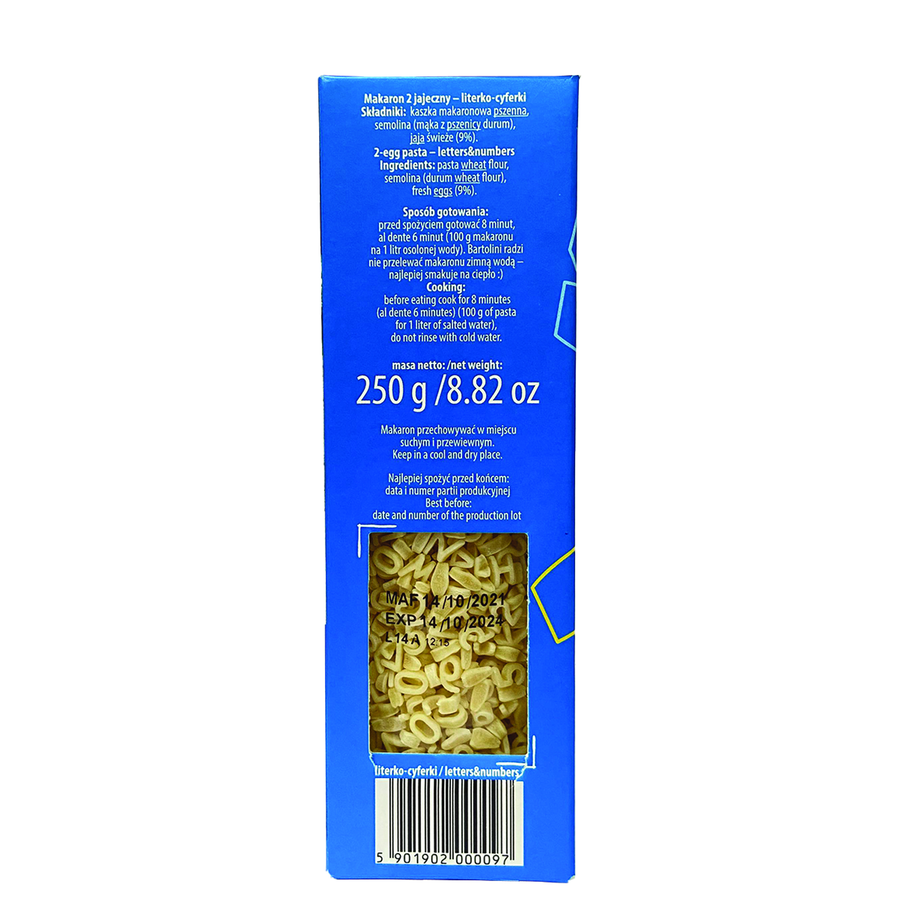 - Nui ăn dặm cho bé semolina Bartolini hình chữ và số 250g có kích thước nhỏ nên ba mẹ có thể nấu dễ dàng cùng với gia vị hay nước sốt, thấm vị nhanh chóng để bé thưởng thức.
