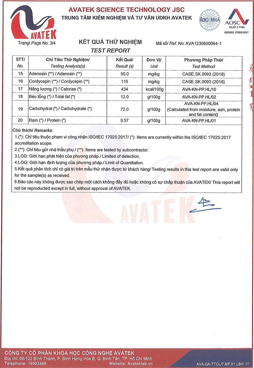 - Gói lớn 75 gam, đủ đầy cho bữa chính. Hình ảnh sản phẩm: Thành phần: Vắt mì: Bột mì, tinh bột khoai mì, 5% bột đông trùng hạ thảo SK, shortening, muối, chất làm dày (E412), chất tạo xốp (E500(i), E500(ii)), chất ổn định (E452(i), E501(i)), màu thực phẩm tổng hợp (E110), chất chống oxy hóa (E321). Các gói gia vị: Sợi đông trùng hạ thảo (50 g/kg), muối ăn, dầu cọ tinh luyện, chất điều vị (E621, E627, E631), đường, bột nấm (25 g/kg), rau (20 g/kg)[cà rốt sấy, ba rô sấy], tiêu, ớt, tỏi, màu hạt điều tự nhiên, ngũ vị hương, chất điều chỉnh độ acid (E330). INGREDIENTS: Noodles: Wheat flour, tapioca starch, 5% Cordyceps SK powder, shortening, salt, thickening agent (E412), foaming agent: (E500 (i), E500 (ii)), stabilizer (E452 (i), E501 (i)), color synthetic food (E110), antioxidant (E321). Soup base: Cordyceps militaris (50 g/kg), salt, refined palm oil, flavor enhancers: (E621, E627, E631), sugar, mushroom powder (25 g/kg), vegetable (20 g/kg) [dried carrots, three dried periwinkle], pepper, chili, garlic, annatto oil, five-spice powder, acidity regulator (E330). GIÁ TRỊ DINH DƯỠNG: Nấm Đông Trùng Hạ Thảo được biết đến nhiều nhất là Cordyceps Sinensis và Cordyceps Militaris, trong đó Cordyceps Militaris có tính năng vượt trội về dược chất có lợi cho sức khỏe con người. Mì Thực Dưỡng Đông Trùng Hạ Thảo bổ sung hàm lượng lớn vitamin, khoáng chất, nguồn năng lượng dồi dào, bồi bổ giúp cơ thể luôn khỏe mạnh và chống suy nhược. Mì Thực Dưỡng Đông Trùng Hạ Thảo có chỉ số năng lượng cao, đối với những người lười chán ăn, thì đây được xem là loại thực phẩm rất phù hợp để cung cấp năng lượng nhanh nhất. Có thể sử dụng liên tục trong thời gian dài mà không lo nóng gan, nổi mụn, v.v… HƯỚNG DẪN SỬ DỤNG / COOKING DIRECTIONS: