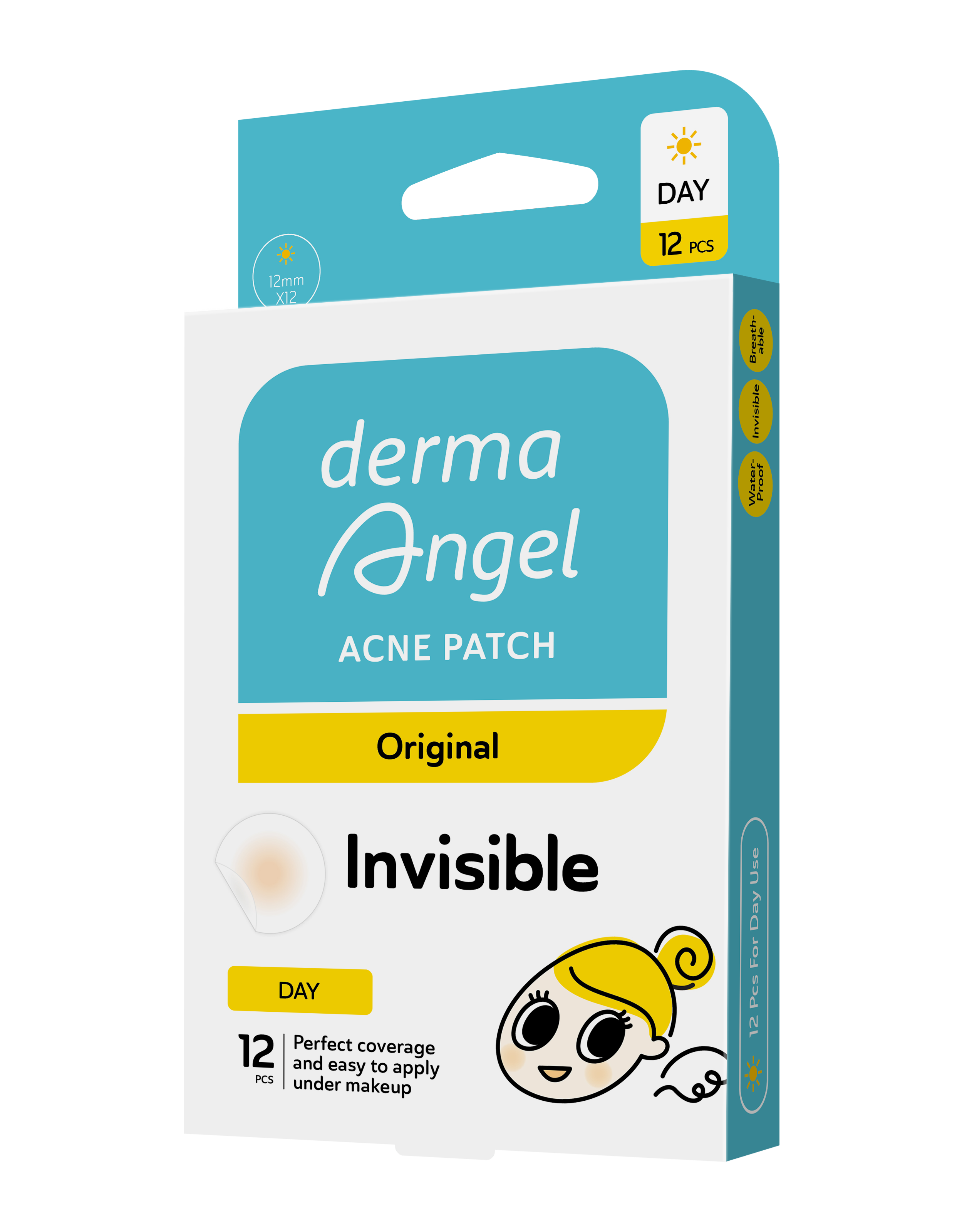 Miếng dán mụn ban ngày Derma Angel (12 miếng/hộp) với thiết kế siêu mỏng và tệp màu da giúp che các khuyết điểm do mụn và giữ lớp trang điểm không bị trôi. Lớp Hydrocolloid