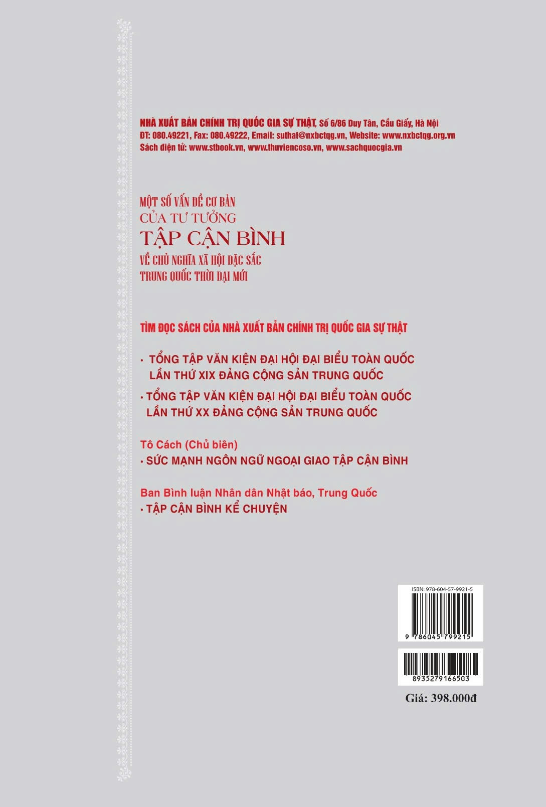 Để tìm hiểu rõ hơn những vấn đề, nội dung có liên quan trong tư tưởng Tập Cận Bình về chủ nghĩa xã hội đặc sắc Trung Quốc thời đại mới, Nhà xuất bản Chính trị quốc gia Sự thật tổ chức biên dịch, xuất bản cuốn sách Một số vấn đề cơ bản của tư tường Tập Cận Bình về chủ nghĩa xã hội đặc sắc Trung Quốc thời đại mới do Trường Đảng Trung ương Đảng Cộng sản Trung Quốc (Học viện Hành chính quốc gia) phối hợp với Nhà xuất bản Nhân dân, Trung Quốc xuất bản. Cuốn sách gồm phần Giới thiệu, 15 chương nội dung chính và Kết luận, tập trung phân tích những vấn đề về quan điểm lý luận, phương châm, sách lược... trong tư tưởng Tập Cận Bình về chủ nghĩa xã hội đặc sắc Trung Quốc thời đại mới, như: kiên trì và phát triển hơn nữa chủ nghĩa xã hội đặc sắc Trung Quốc; kiên trì lập trường căn bản lấy nhân dân làm trung tâm; quan điểm phát triển mới “sáng tạo, hài hòa, xanh, mở cửa, cùng chia sẻ”; kiên trì đi sâu cải cách toàn diện và mở cửa toàn diện; xây dựng Trung Quốc thành cường quốc hiện đại hóa xã hội chủ nghĩa giàu mạnh, dân chủ, văn minh, hài hòa, tươi đẹp; thực hiện Giấc mơ Trung Quốc phục hưng vĩ đại dân tộc Trung Hoa