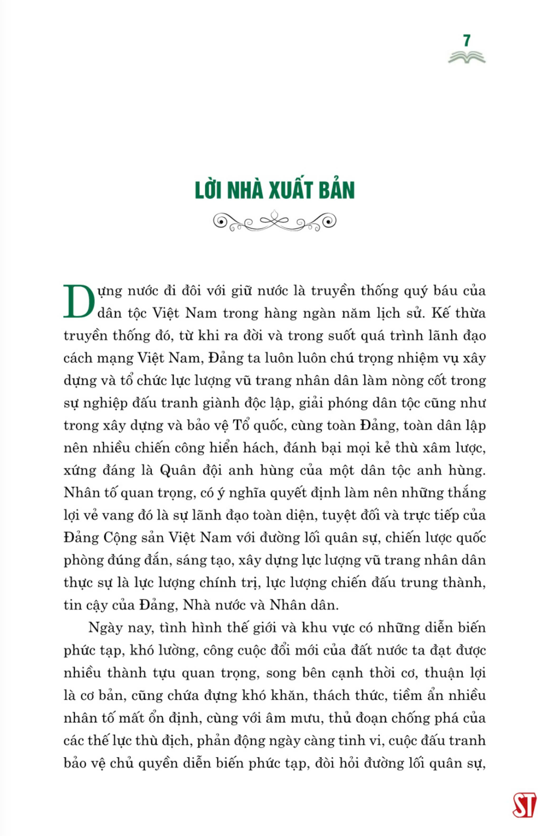 Dựng nước đi đôi với giữ nước là truyền thống quý báu của dân tộc Việt Nam trong hàng ngàn năm lịch sử. Kế thừa truyền thống đó, từ khi ra đời và trong suốt quá trình lãnh đạo cách mạng Việt Nam, Đảng ta luôn luôn chú trọng nhiệm vụ xây dựng và tổ chức lực lượng vũ trang nhân dân làm nòng cốt trong sự nghiệp đấu tranh giành độc lập, giải phóng dân tộc cũng như trong xây dựng và bảo vệ Tổ quốc, cùng toàn Đảng, toàn dân lập nên nhiều chiến công hiển hách, đánh bại mọi kẻ thù xâm lược, xứng đáng là Quân đội anh hùng của một dân tộc anh hùng. Nhân tố quan trọng, có ý nghĩa quyết định làm nên những thắng lợi vẻ vang đó là sự lãnh đạo toàn diện, tuyệt đối và trực tiếp của Đảng Cộng sản Việt Nam với đường lối quân sự, chiến lược quốc phòng đúng đắn, sáng tạo, xây dựng lực lượng vũ trang nhân dân thực sự là lực lượng chính trị, lực lượng chiến đấu trung thành, tin cậy của Đảng, Nhà nước và Nhân dân.  Ngày nay, tình hình thế giới và khu vực có những diễn biến phức tạp, khó lường, công cuộc đổi mới của đất nước ta đạt được nhiều thành tựu quan trọng, song bên cạnh thời cơ, thuận lợi là cơ bản, cũng chứa đựng khó khăn, thách thức, tiềm ẩn nhiều nhân tố mất ổn định, cùng với âm mưu, thủ đoạn chống phá của các thế lực thù địch, phản động ngày càng tinh vi, cuộc đấu tranh bảo vệ chủ quyền diễn biến phức tạp, đòi hỏi đường lối quân sự.