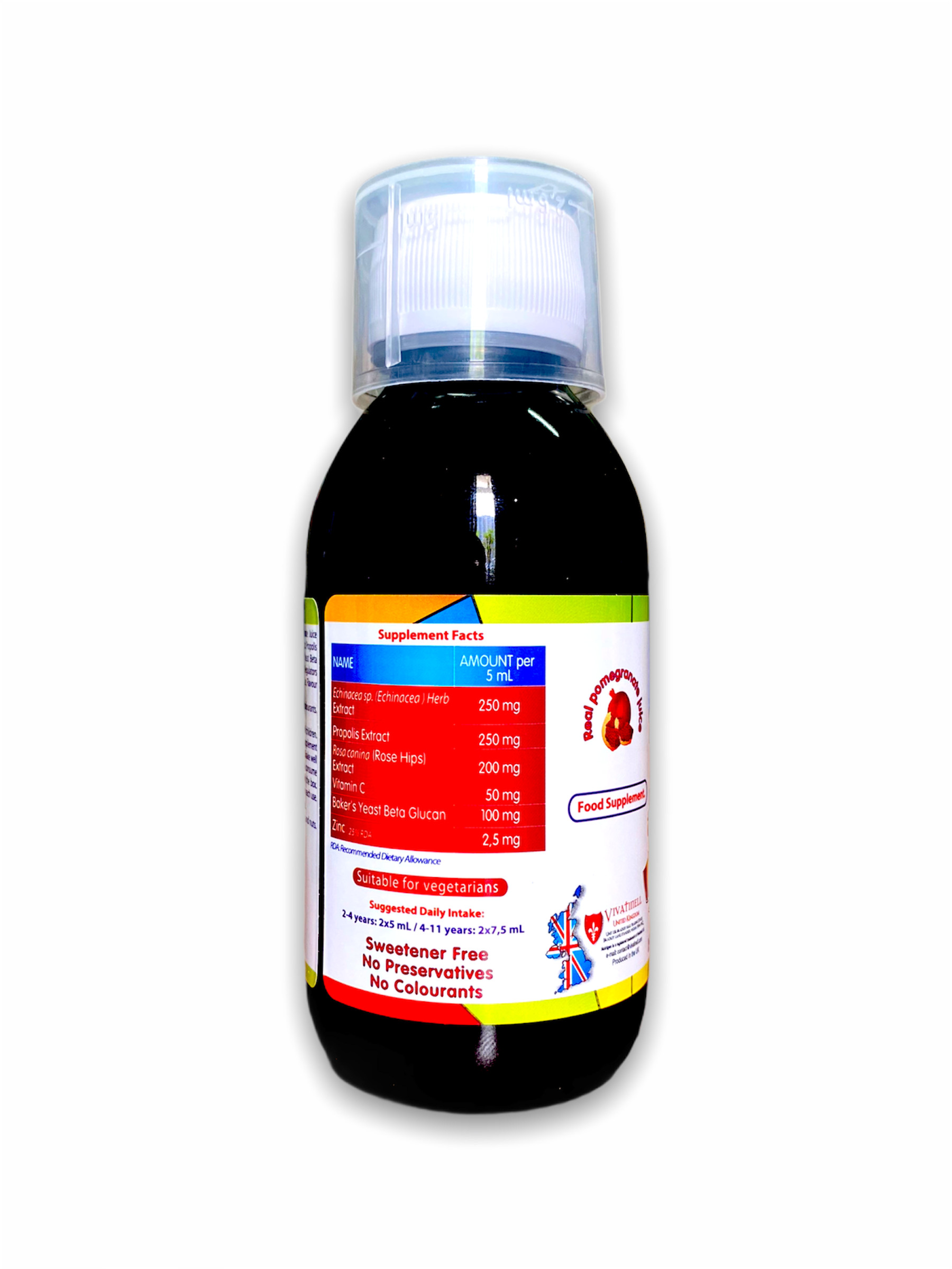 - Giảm số ngày bị sốt Thành phần Chiết xuất cúc nhím (Echinacea sp.), Chiết xuất keo ong, Chiết xuất nụ tầm xuân (Rosa Canina), Vitamin C (acid L-ascorbic), Beta glucan chiết xuất từ nấm men, Kẽm (Kẽm sulfat). Phụ liệu: Nước khử ion, fructose (hoa quả), nước ép lựu cô đặc, chất điều chỉnh acid (Trinatri citrate dihydrat, acid citric), hương lựu tự nhiên, chất làm dày (xanthan gum). Công dụng Hỗ trợ nâng cao sức khỏe, hỗ trợ tăng cường sức đề kháng, hỗ trợ giảm nguy cơ viêm đường hô hấp trên do sức đề kháng kém. Đối tượng sử dụng Trẻ em hay bị viêm đường hô hấp trên khi thay đổi thời tiết, giao mùa do sức đề kháng kém, có nhu cầu bổ sung để tăng cường sức đề kháng. Hướng dẫn sử dụng Khuyến cáo hàng ngày: Trẻ 2-4 tuổi: 5ml/lần, 2 lần/ngày Trẻ 4-11 tuổi: 7,5ml, 2 lần/ngày Khuyến cáo Không sử dụng quá liều hàng ngày. Không sử dụng thay thế cho chế độ ăn bình thường. Không sử dụng cho người mẫn cảm với bất kì thành phần nào của sản phẩm. Thực phẩm này không phải là thuốc và không có tác dụng thay thế thuốc chữa bệnh. Lắc kỹ trước khi dùng. NSX: Xem trên hộp. HSD: 36 tháng kể từ ngày sản xuất. HSD in trên hộp. Bảo quản: Nơi khô mát, tránh xa tầm tay trẻ em. Sau khi mở nắp, bảo quản trong ngăn mát tủ lạnh. Sử dụng trong vòng 06 tháng. Quy cách đóng gói: Hộp 1 lọ 150ml Xuất xứ: Vương Quốc Anh Nhà sản xuất: Vivatinell Ltd. Unit 138, Bradley Hall Trading Estate, Bradley Lane, Standish, Wigan, WN6 0XQ, Vương Quốc Anh Thương nhân chịu trách nhiệm về chất lượng: Công ty Cổ phần Dược phẩm AMVI (Amvipharm) Lô B14-3,4 đường N13, khu công nghiệp Đông Nam, Hòa Phú, Củ Chi, TP.HCM Số ĐKSP: 4702/2020/ĐKSP Số XNQC: 2347/2020/XNQC-ATTP