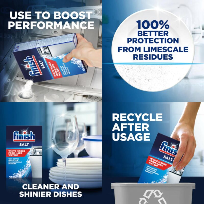 Muối rửa chén bát Finish đảm bảo an toàn cho gia đình bạn trong khâu vệ sinh ăn uống. Tương thích với tất cả các dòng máy rửa chén bát. Tác dụng chính của muối Finish là làm mềm nước trong máy rửa bát vì nếu nước quá cứng sẽ làm giảm hiệu quả của máy rửa chén bát và làm đọng lại thức ăn thừa, từ do sinh ra vi khuẩn có hại cho sức khỏe.