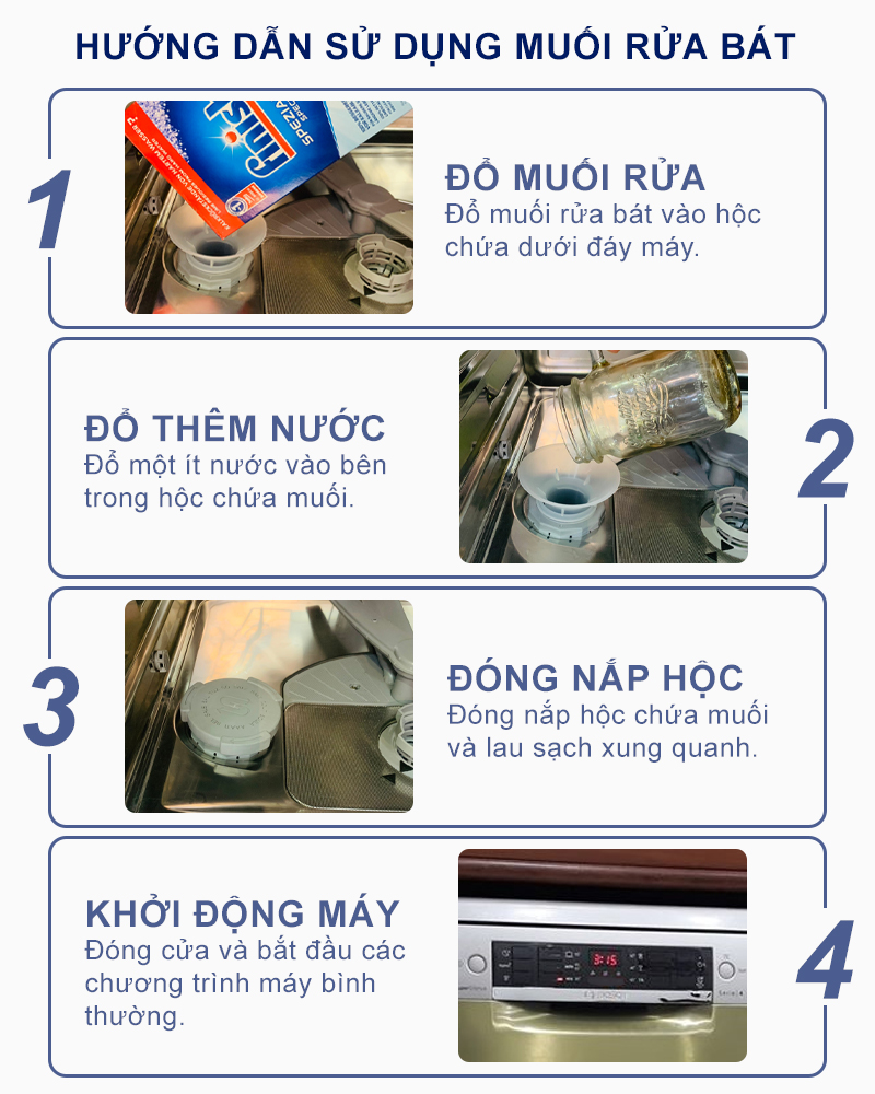 Mở nắp khay đựng muối của máy rửa chén bát, đổ một lượng vừa đủ rồi sau đó đổ đầy nước bình chứa muối. Dùng vật dụng có cán dài quấy đều muối chứa trong bình để muối có thể hòa tan với nước và làm tăng nồng độ của muối chứa trong bình. Chức năng của máy có thể nhận biết và đo đếm được nồng độ muối và báo hiệu cho bạn là lượng muối đã đủ hay chưa.