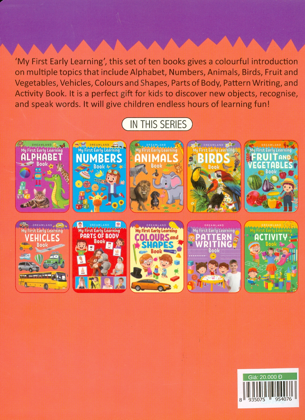 Mua tại Tiktok'My First Early Learning' gồm 10 cuốn sách:- Bảng chữ cái, Số, Động vật, Chim, Trái cây và Rau củ, Màu sắc và Hình dạng, Các bộ phận của Cơ thể, Viết theo Mẫu và Hoạt động. Bộ sách vui nhộn và mang tính giáo dục với những hình ảnh dễ thương sống động này là sự lựa chọn tốt nhất cho trẻ em.