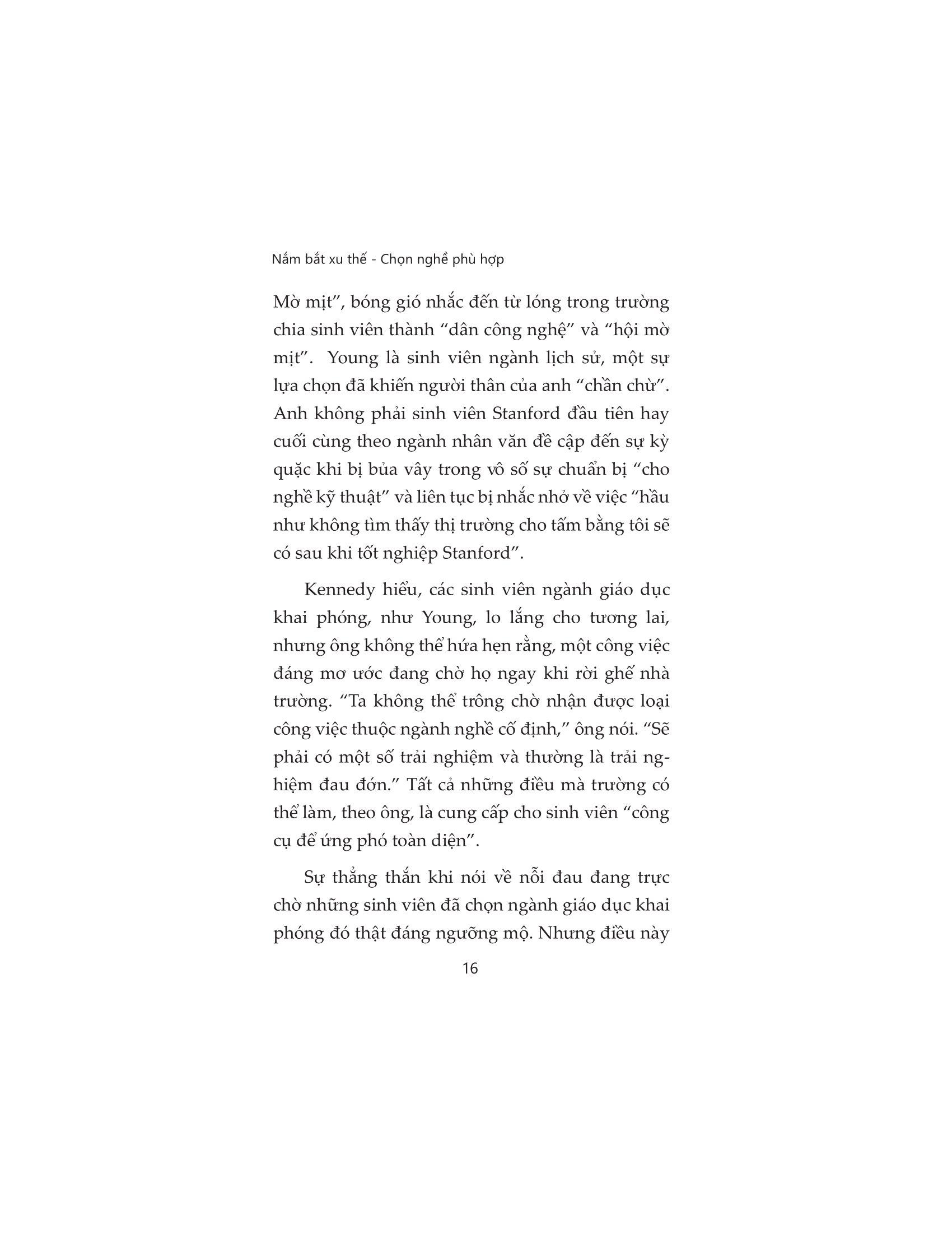 Bất kể ngành học mà bạn muốn hoặc đang theo đuổi là gì, nếu như bạn cảm thấy hoang mang về cuộc sống hậu đại học và muốn trang bị cho bản thân những kỹ năng nghề nghiệp tốt nhất ngay từ bây giờ, hãy bắt đầu bằng cách đọc Nắm bắt xu thế - Chọn nghề phù hợp. Những câu chuyện thực tiễn trong cuốn sách này sẽ cung cấp những lời khuyên và giúp bạn tự rút ra những điều cần làm, ví dụ như tham gia các kỳ thực tập ngay từ năm hai hay xây dựng mạng lưới quan hệ với các cựu sinh viên. Bạn sẽ vừa có thể theo đuổi đam mê tri thức, vừa tích lũy được những kỹ năng mềm và kỹ năng chuyên môn thiết thực để sẵn sàng đối mặt với tương lai bất định.