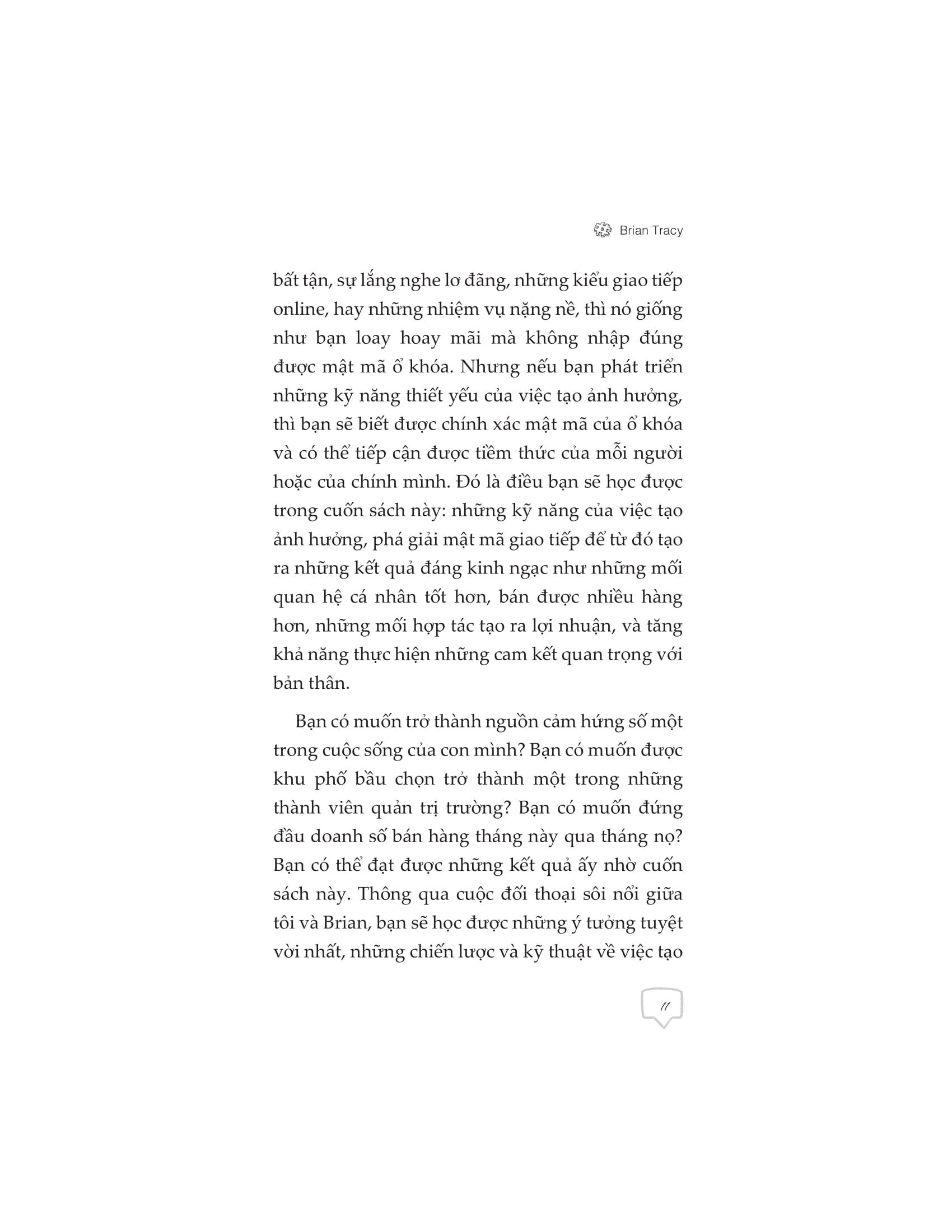 Nâng tầm ảnh hưởng giống như mật mã của một ổ khóa làm bằng titan. Hãy tưởng tượng khả năng giao tiếp chính là mật mã đúng của khóa, và ổ khóa đó đang cất giữ tiềm thức của người khác hoặc chính bản thân bạn. Nếu tất cả những gì bạn làm chỉ là trao đổi qua những cuộc nói chuyện dài bất tận, sự lắng nghe lơ đãng, những kiểu giao tiếp online, hay những nhiệm vụ nặng nề, thì nó giống như bạn loay hoay mãi mà không nhập đúng được mật mã ổ khóa. Nhưng nếu bạn phát triển những kỹ năng thiết yếu của việc tạo ảnh hưởng, thì bạn sẽ biết được chính xác mật mã của ổ khóa và có thể tiếp cận được tiềm thức của mỗi người hoặc của chính mình. Đó là điều bạn sẽ học được trong cuốn sách này: những kỹ năng của việc tạo ảnh hưởng, phá giải mật mã giao tiếp để từ đó tạo ra những kết quả đáng kinh ngạc như những mối quan hệ cá nhân tốt hơn, bán được nhiều hàng hơn, những mối hợp tác tạo ra lợi nhuận, và tăng khả năng thực hiện những cam kết quan trọng với bản thân.