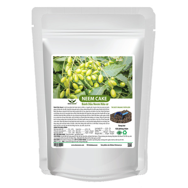 Thông tin sản phẩm Bánh dầu neem Neemcake hữu cơ DOCNEEM: Phân bón hữu cơ hoàn toàn tự nhiên ép theo công nghệ hiện đại ""COLD PRESSED" Neemcake là phân bón 100% tự nhiên, nguồn gốc từ quả và hạt cây neem ép lạnh. Túi 1kg (Túi bạc cao cấp). Thương hiệu DOCNEEM đã được đăng ký bảo hộ tại cục sở hữu trí tuệ Việt Nam. Có hàm lượng Aradirachtin tự nhiên cao nhất thị trường 2000ppm. Kết cấu hình dạng: Dạng hạt Pillet - giải phóng chậm. Neem cake giúp sai hoa đẩy chồi, trị tuyến trùng trong đất Công dụng Bánh dầu neem Neemcake hữu cơ DOCNEEM: Cải thiện kết cấu đất, tăng khả năng giữ nước và tăng cường thông khí cho đất,  rễ phát triển tốt hơn. Kích thích làm tăng sự phát triển lá, hoa hồng, giúp hoa nở nhiều và sai hơn. Neemcake có thể được trộn với các loại phân hữu cơ khác (đặc biệt phân Ure) giúp làm chậm quá trình chuyển các hợp chất đạm (Nitơ) thành khí Nitơ, giữ đạm (Nitơ) cho cây sử dụng trong thời gian dài hơn. Bánh Dầu Neem ngăn ngừa và điều trị các bệnh vàng lá, thiếu vi lượng do rối loạn hoặc thiếu, mất cân bằng các thành phần dinh dưỡng. Bảo vệ cây khỏi tuyến trùng và trị sâu bệnh gây hại cho rễ như Sùng đất, cuốn chiếu. Cung cấp dinh dưỡng đầy đủ và cân bằng, làm tăng năng suất và độ phì nhiêu của đất, có đặc tính chống nấm mạnh mẽ. Có thể được sử dụng một cách an toàn cho tất cả các loại cây như hoa hồng, hoa lan, cây cảnh, cây ăn trái. Công nghệ ép lạnh cùng hạt Pillet giải phóng chậm Hàm lượng vi lượng có trong Bánh dầu neem Neemcake hữu cơ DOCNEEM: Nitơ toàn phần (N) ... 2% - 2,5% Phốt pho toàn phần (P) . 0,6% - 1,4% Kali toàn phần (K) .... 1,2% - 1,6% Canxi (Ca): .0,5% -3% Kẽm (Zn): .15 ppm - 60 ppm Đồng (Cu): .4 ppm -20 ppm Lưu huỳnh (S): .. 0,2% - 3% Magie (Mg): .0.3% - 1% Sắt (Fe): . 500 ppm - 1200 ppm Mangan (Mn): . 20 ppm - 60 ppm Nitơ toàn phần (N) ... 2% - 2,5% Phốt pho toàn phần (P) . 0,6% - 1,4% Kali toàn phần (K) .... 1,2% - 1,6% Canxi (Ca): .0,5% -3% Kẽm (Zn): .15 ppm - 60 ppm Đồng (Cu): .4 ppm -20 ppm Lưu huỳnh (S): .. 0,2% - 3% Magie (Mg): .0.3% - 1% Sắt (Fe): . 500 ppm - 1200 ppm Mangan (Mn): . 20 ppm - 60 ppm Hướng dẫn sử dụng Bánh dầu neem Neemcake hữu cơ Docneem: Cây đã sang chậu: Cày xới đất sâu xung quanh rễ, trộn đều đất với Neem cake (lưu ý cách xa rễ) Cây sang chậu mới: Trộn đều với đất và giá thể Thông thường bón khoảng 100g - Bánh Dầu Neem cho mỗi cây nhỏ và trung bình, đối với cây lớn thì dùng 100g - 200g Bánh Dầu Neem để có hiệu quả cao nhất Sau 1 tháng phải bón lại. Bánh dầu neem - sản phẩm hữu cơ, an toàn tuyệt đối với người sử dụng