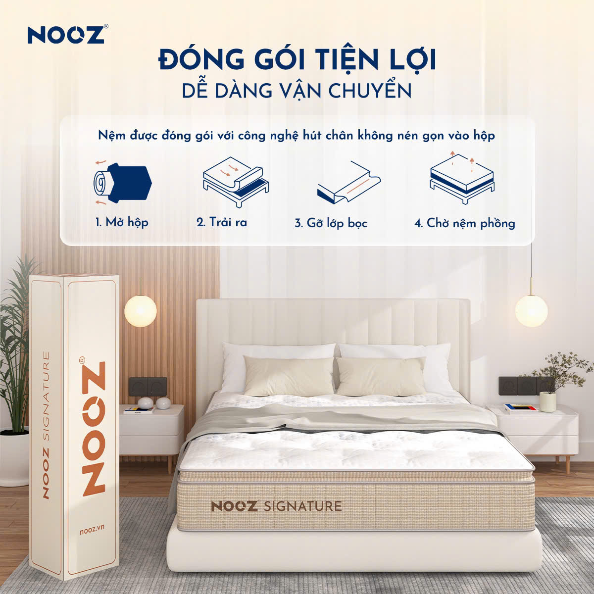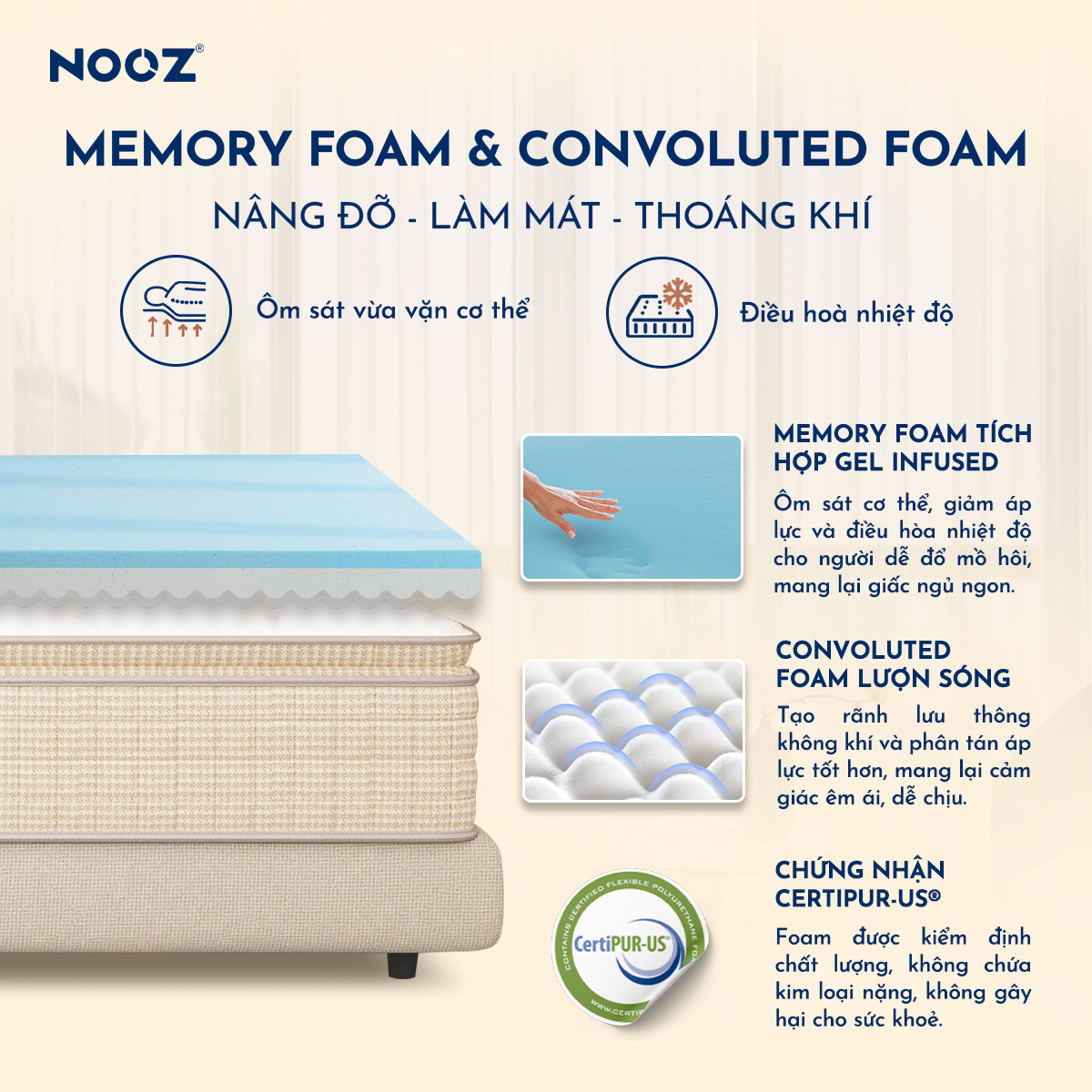 - Sản phẩm nệm NOOZ Signature bao gồm: Vải bọc Ice Silk, Memory Foam tích hợp Gel Infused, Convoluted Foam, PU Foam, Cao su thiên nhiên Latex, Hàng trăm lò xo túi độc lập cao cấp nâng đỡ 7 vùng, Foam encasement, Đáy chống trượt
